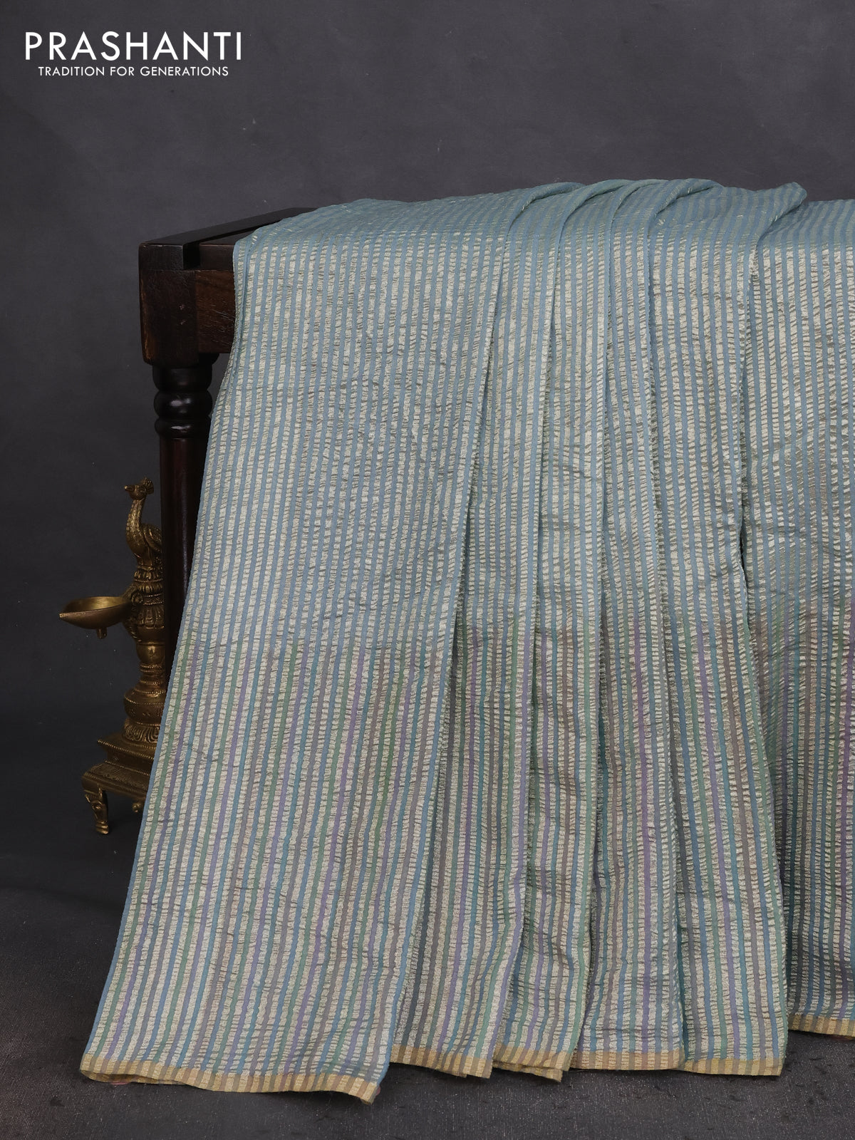 Munga silk saree pastel blue with allover zari woven stripes pattern in borderless style