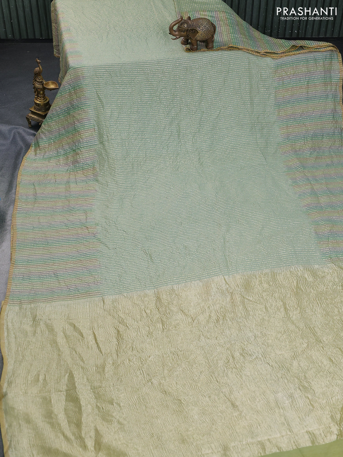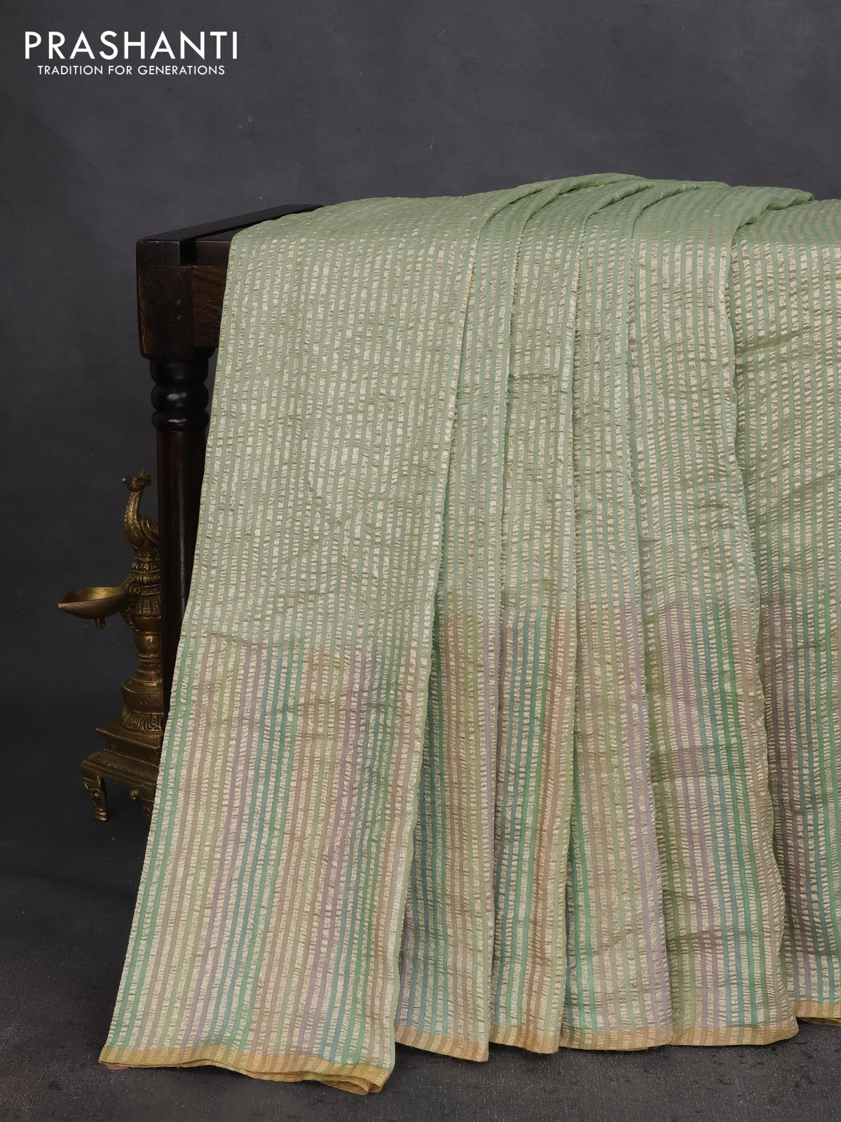 Munga silk saree pastel green and multi colour with allover zari woven stripes pattern in borderless style
