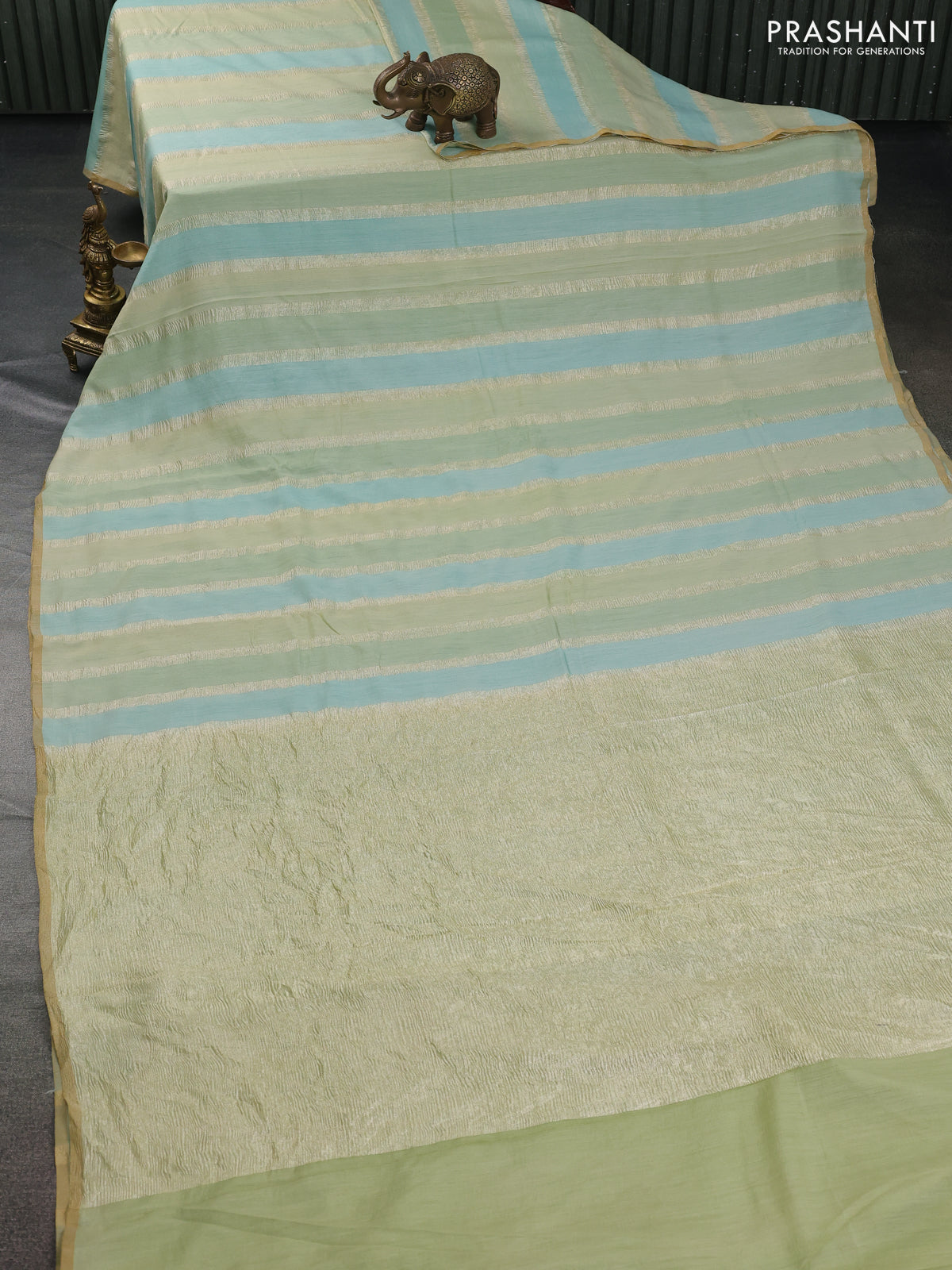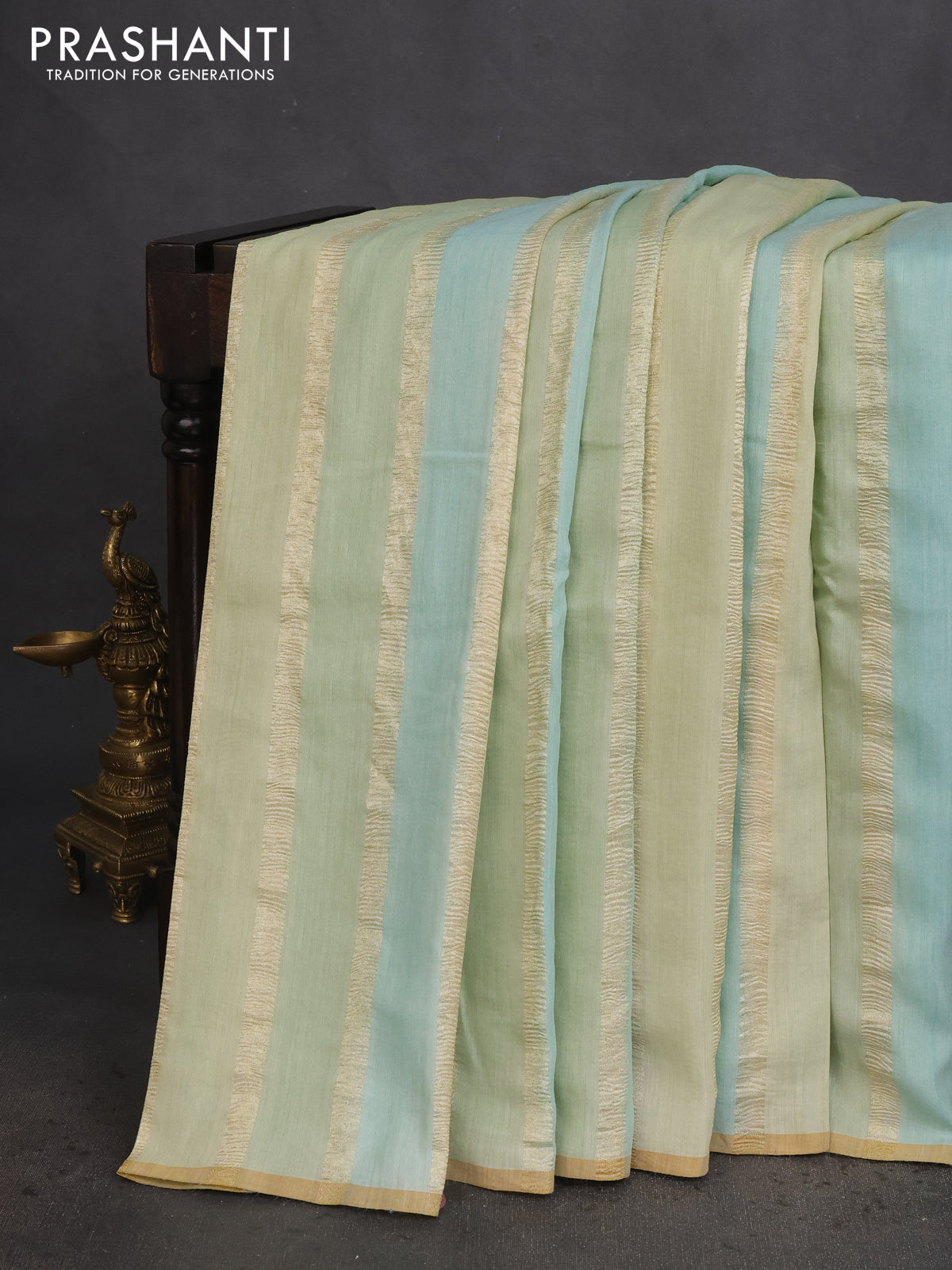 Munga silk saree pastel green and pastel blue with allover zari woven stripes pattern in borderless style