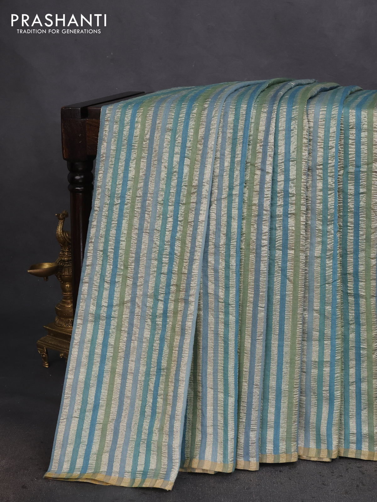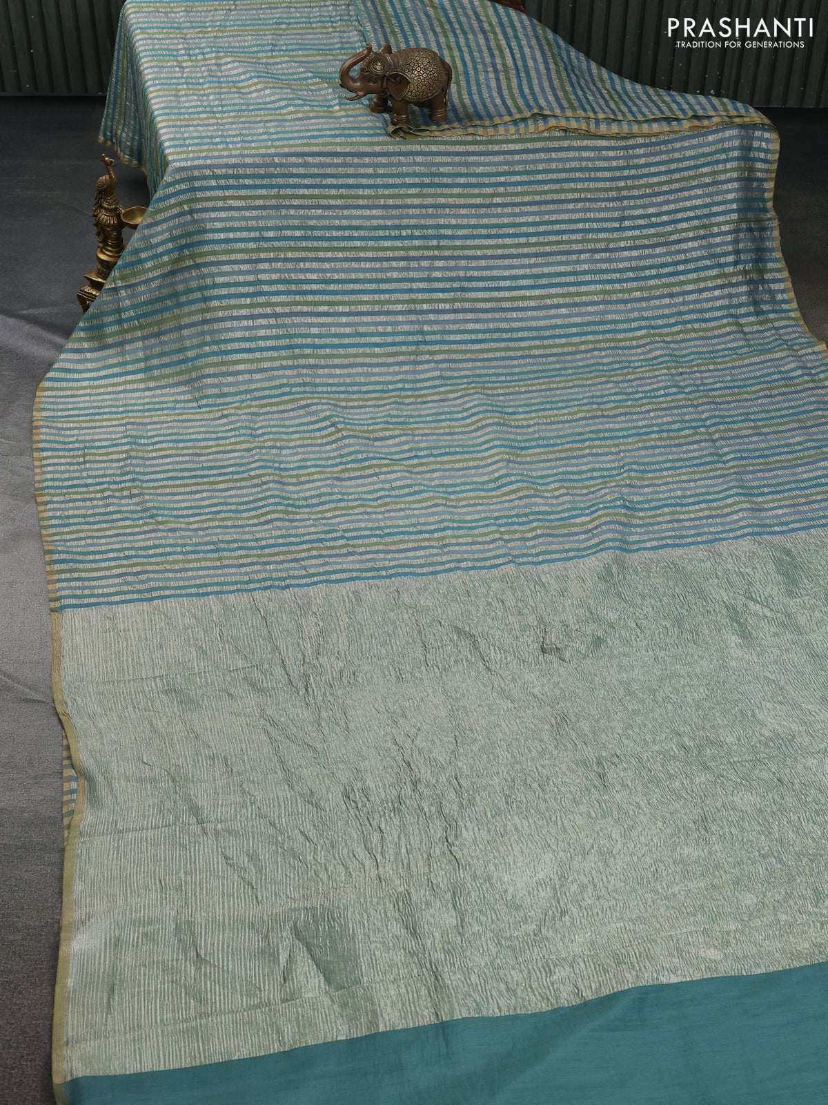 Munga silk saree teal blue with allover zari woven stripes pattern in borderless style