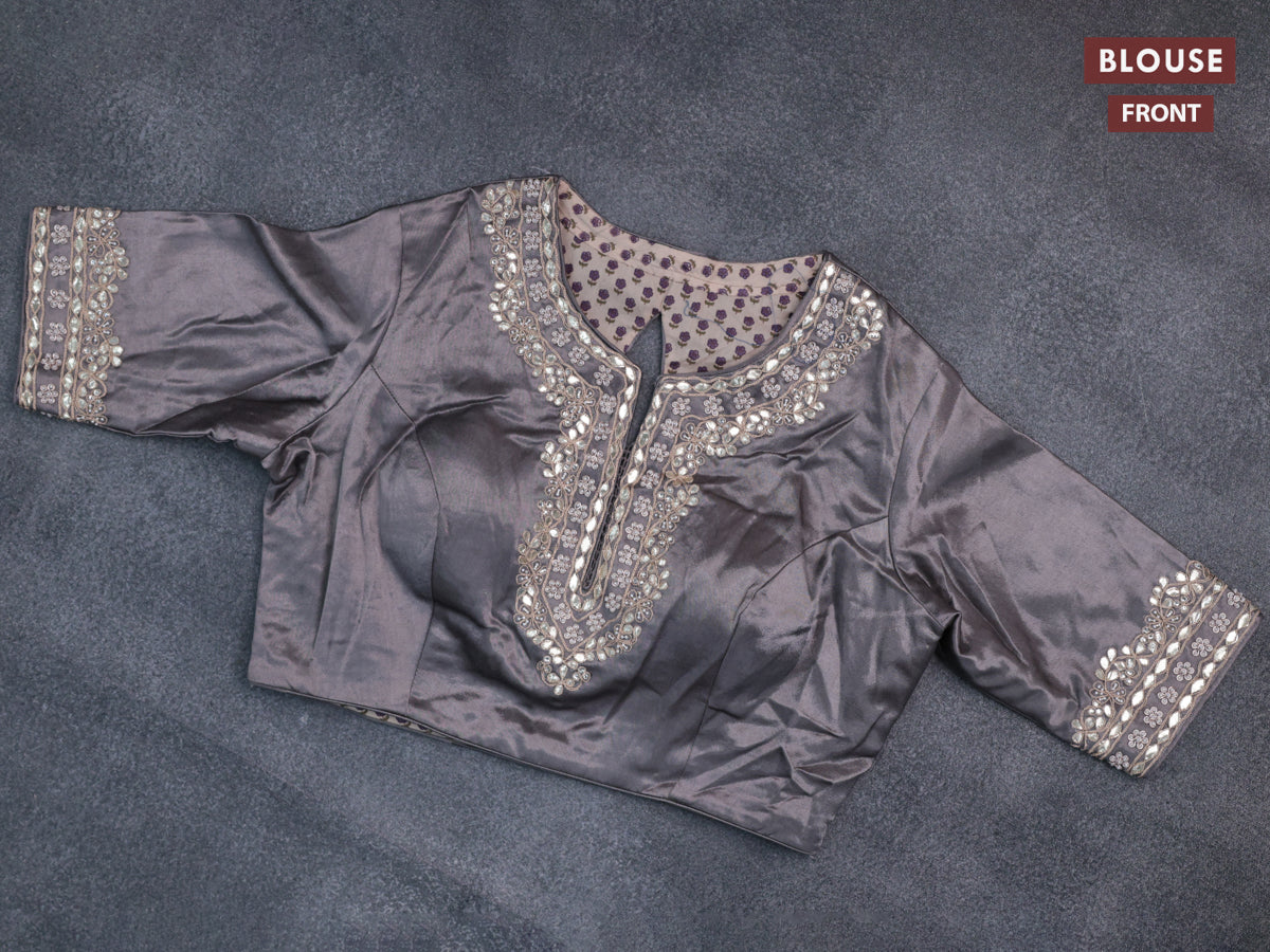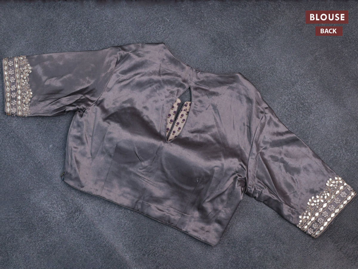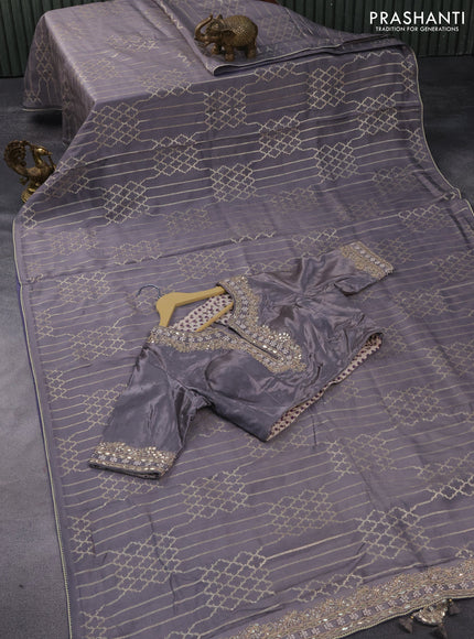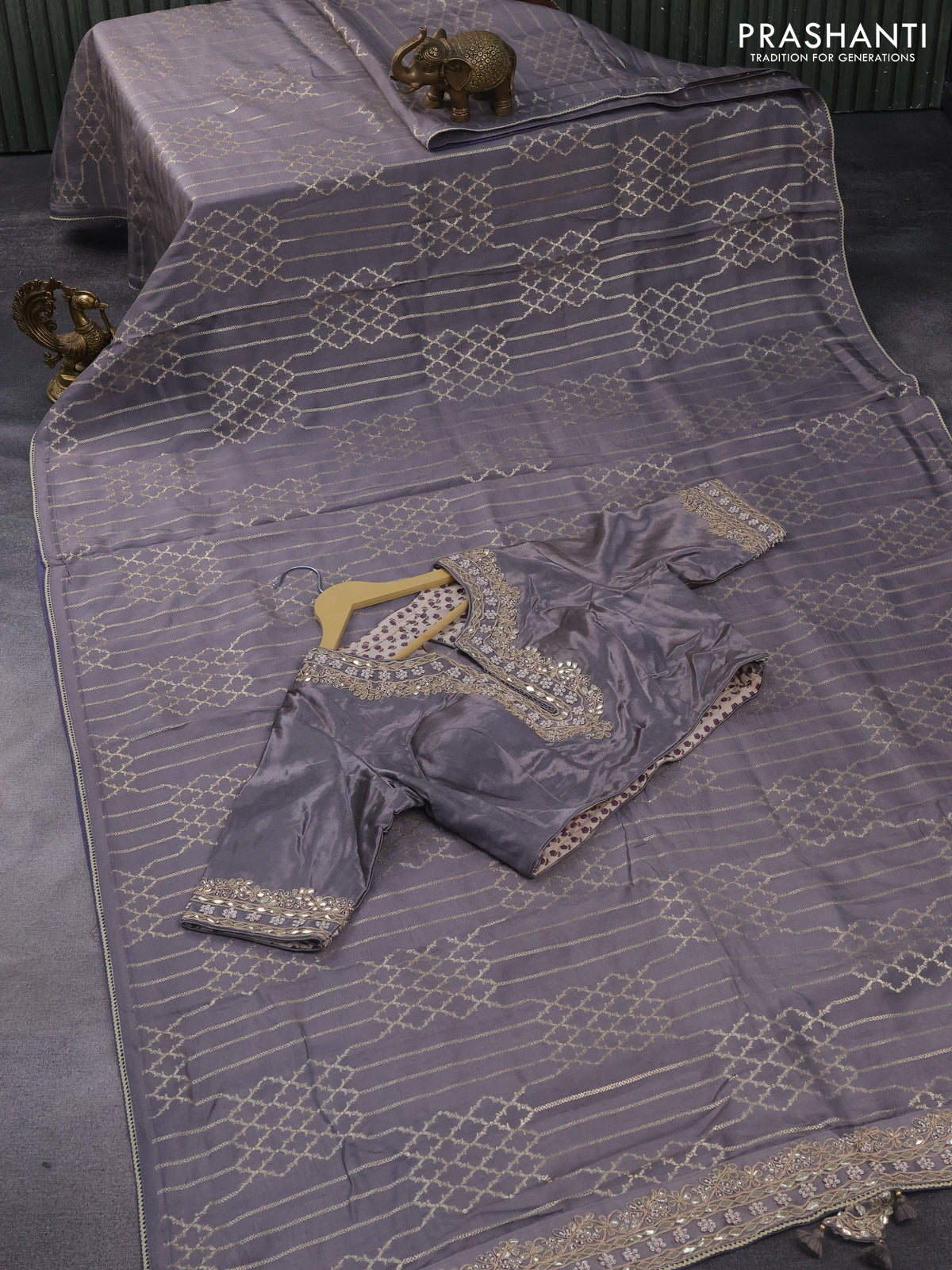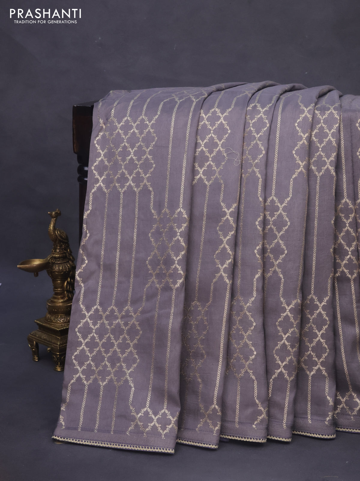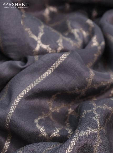 Munga tussar saree grey with allover zari weaves and lace work blue