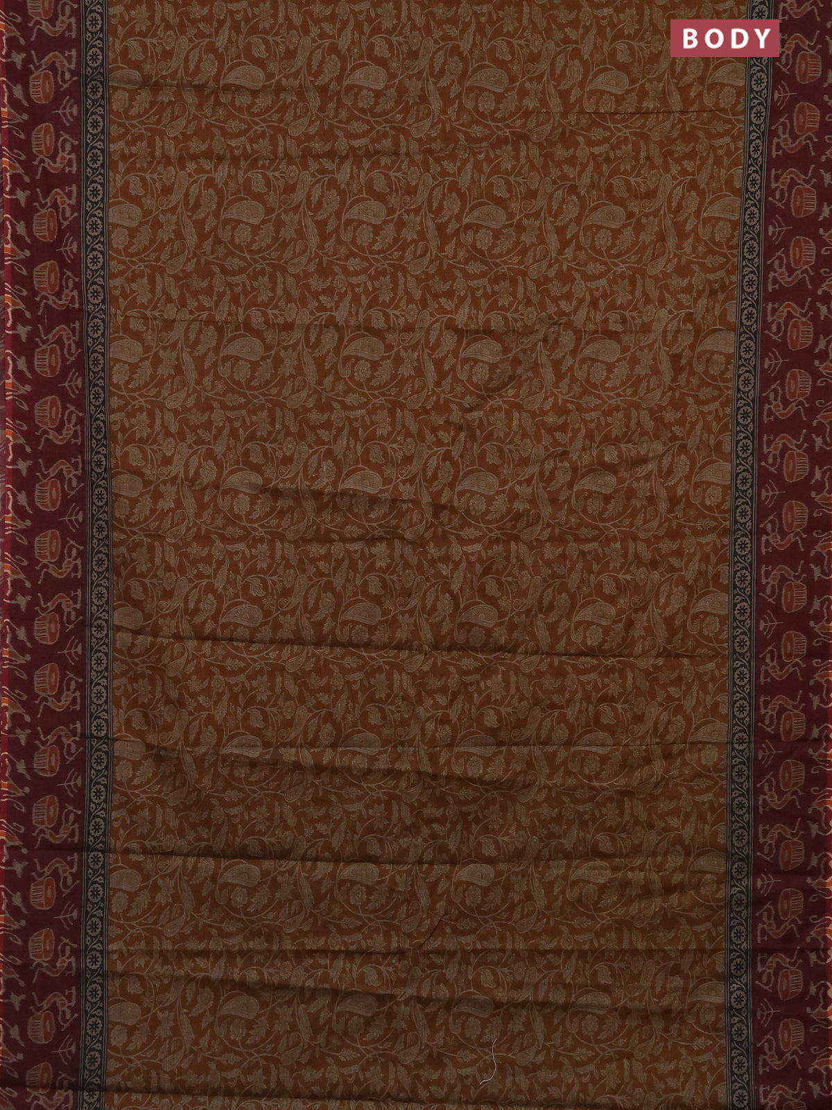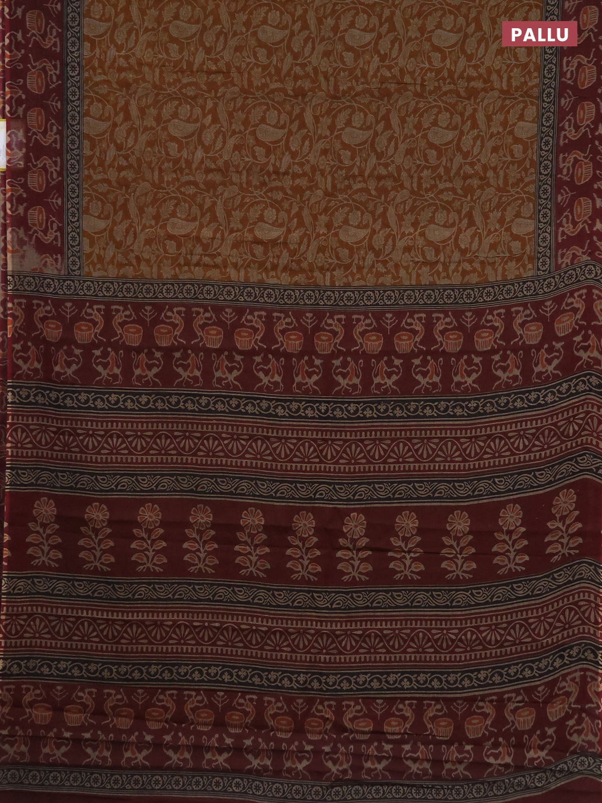 Muslin cotton saree dark mustard and maroon with allover prints and printed border