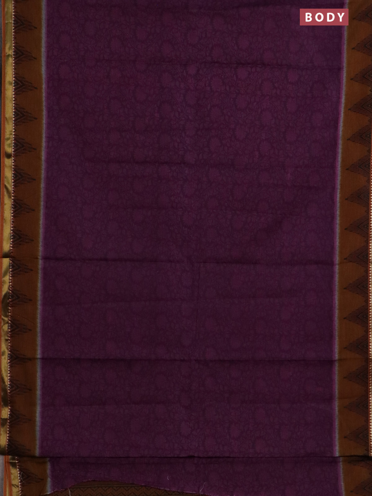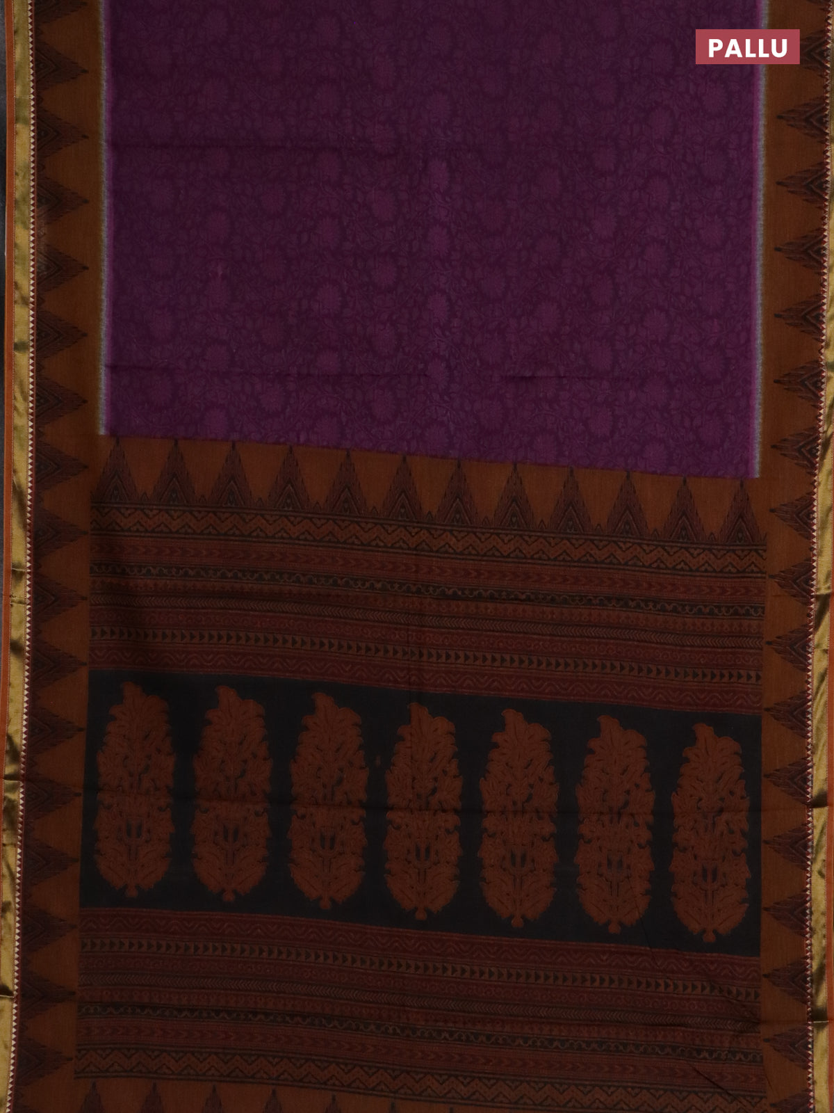 Muslin cotton saree deep purple and dark mustard with allover prints and woven border