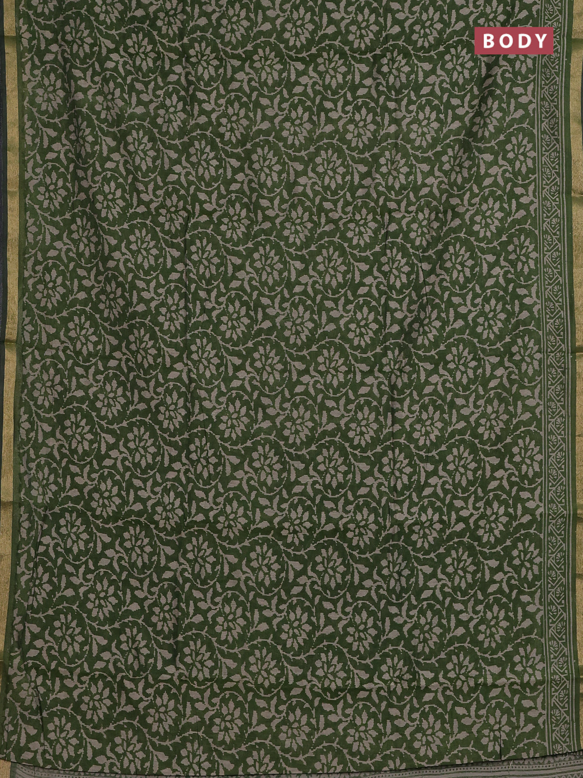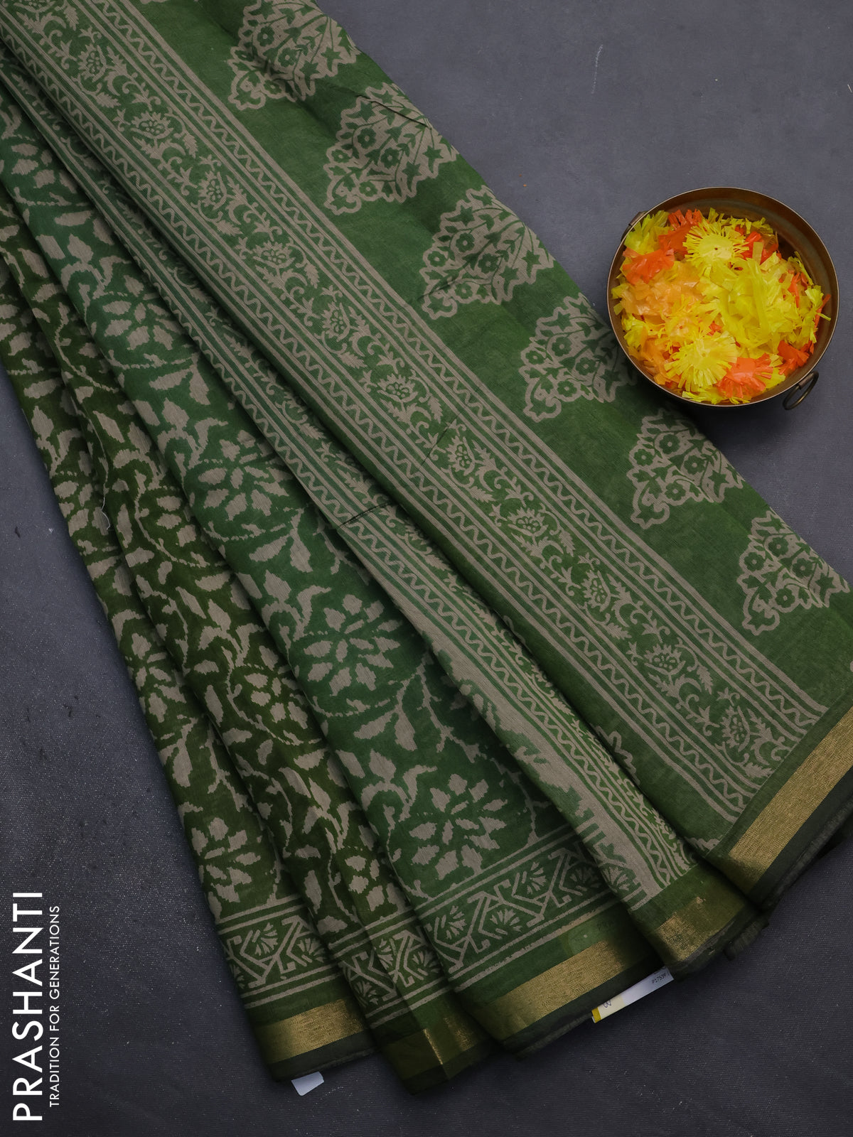 Muslin cotton saree green with allover prints and zari woven border