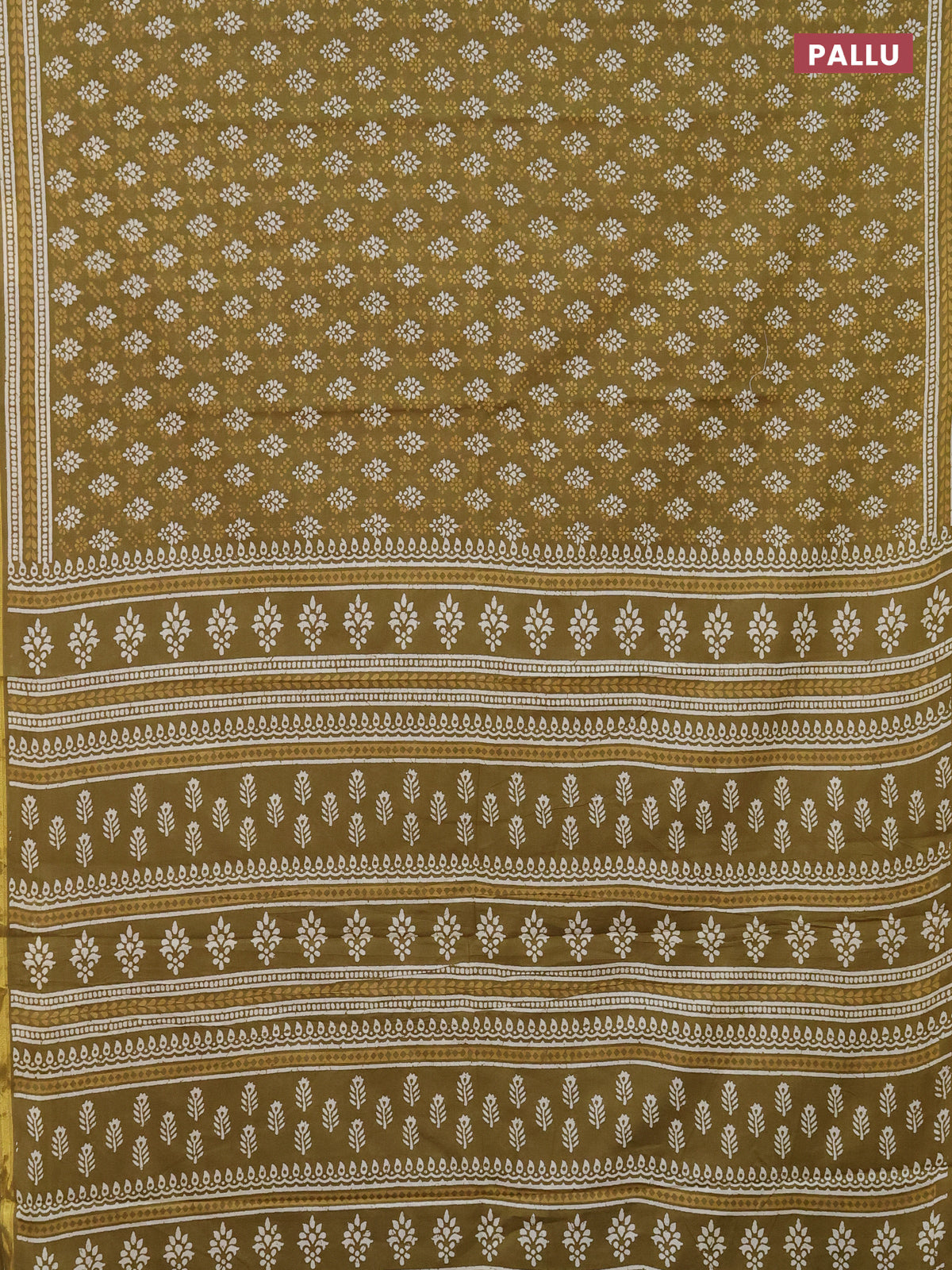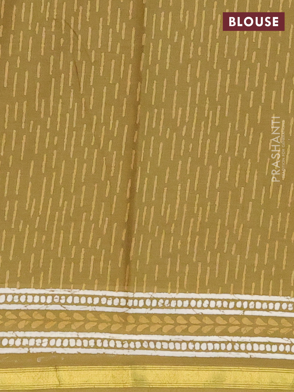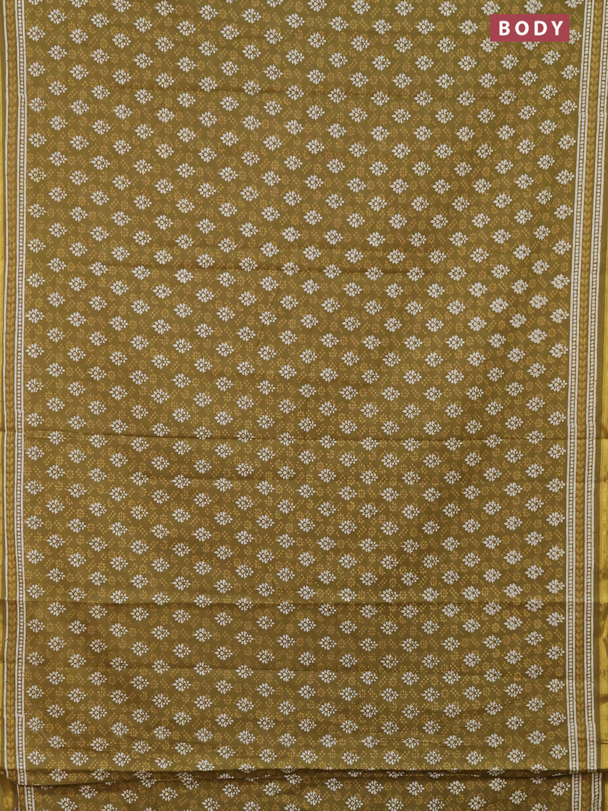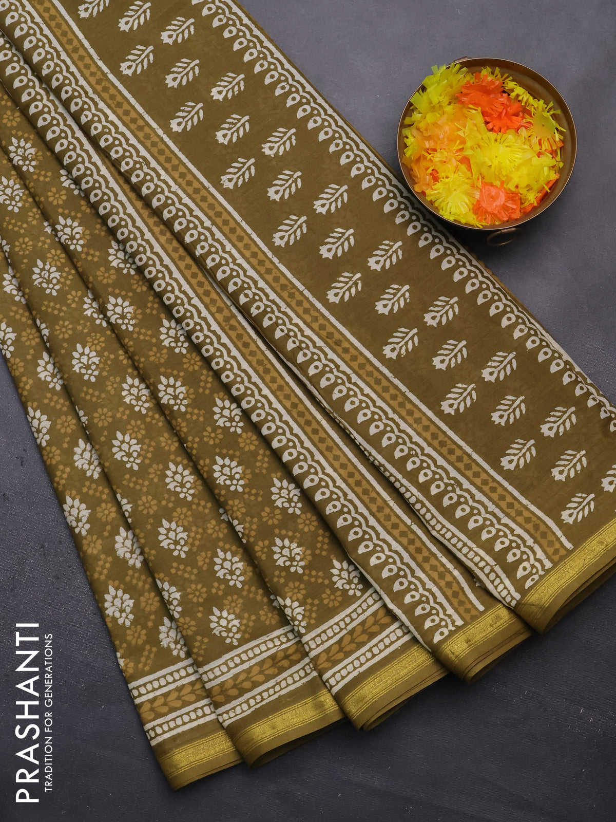 Muslin cotton saree mehendi green with allover prints and zari woven border