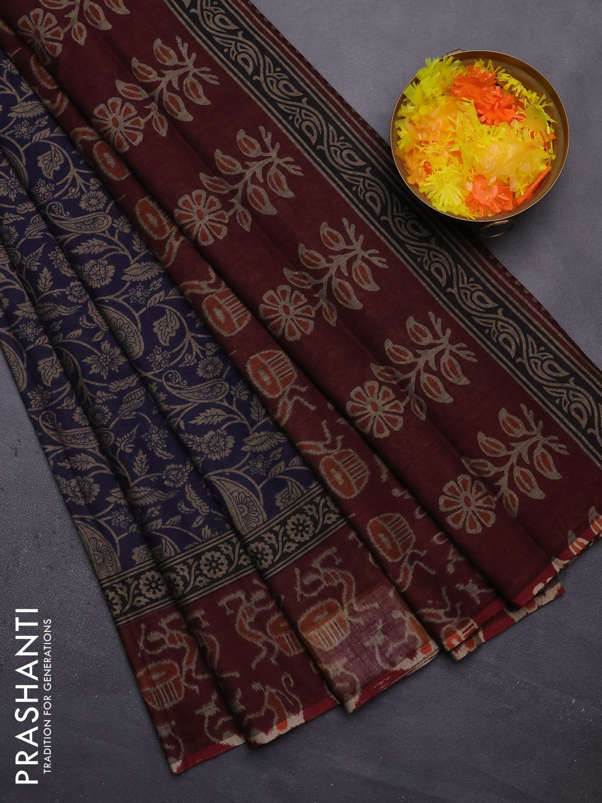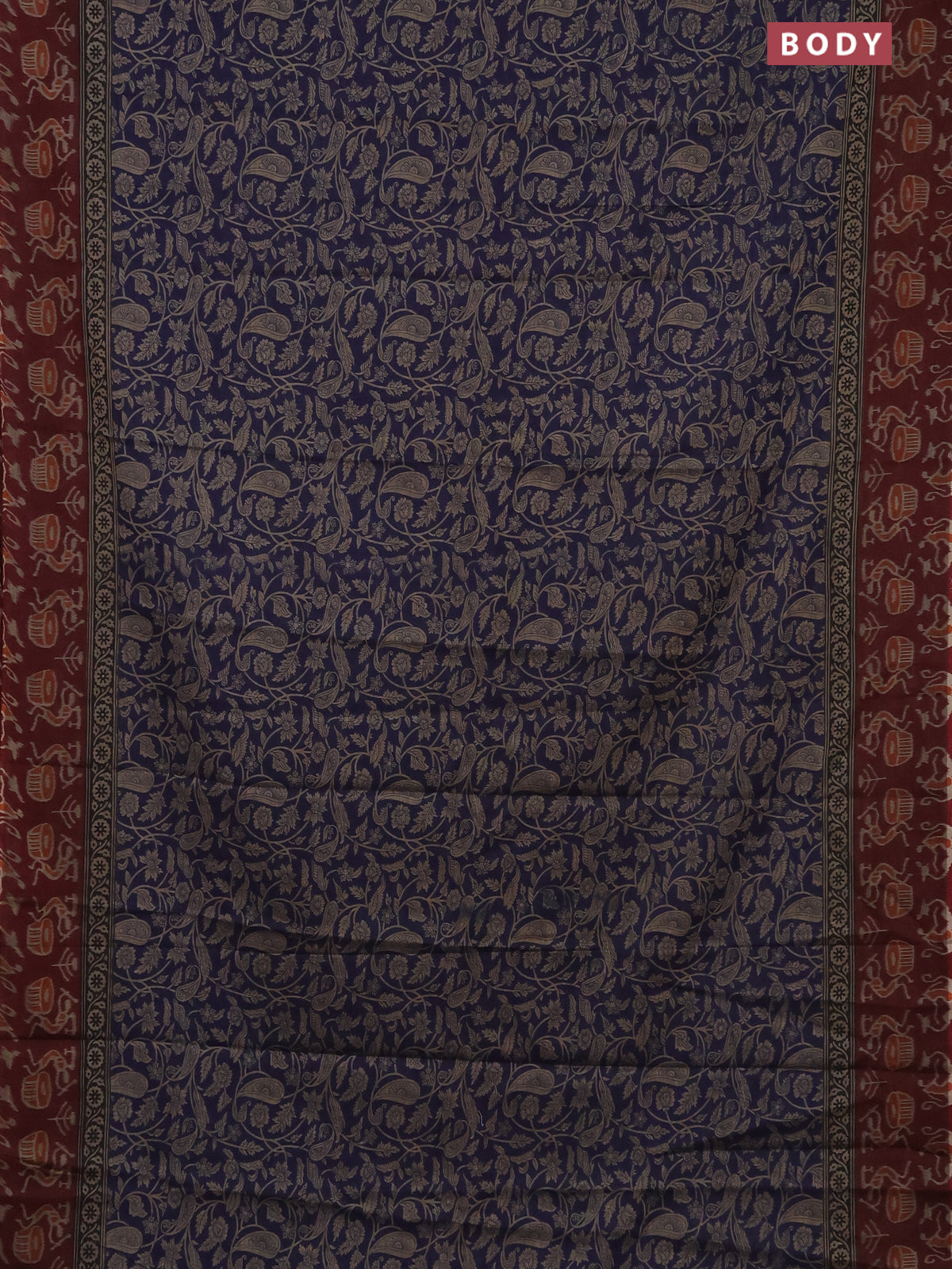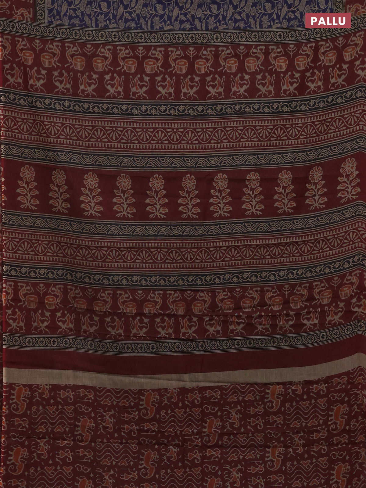 Muslin cotton saree navy blue and maroon with allover prints and printed border