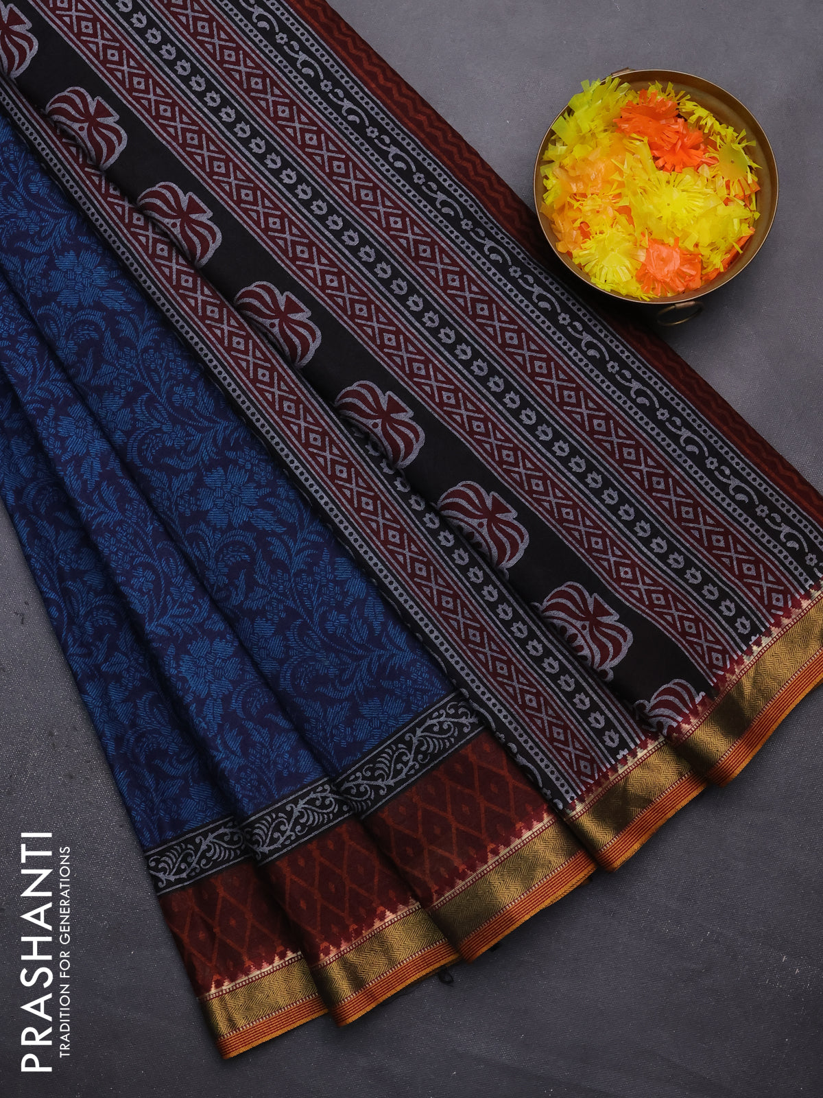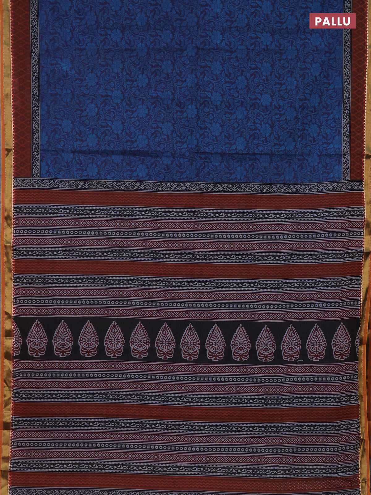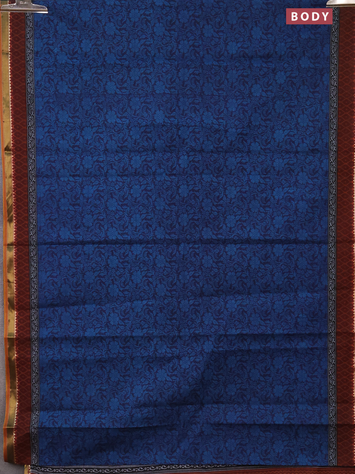 Muslin cotton saree navy blue and maroon with allover prints and zari woven border