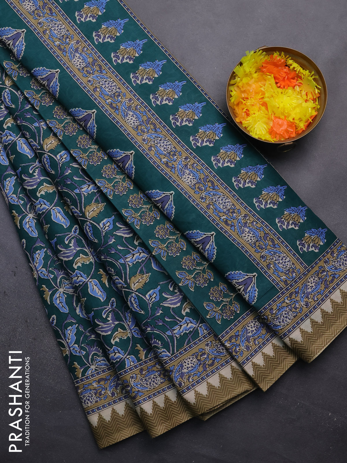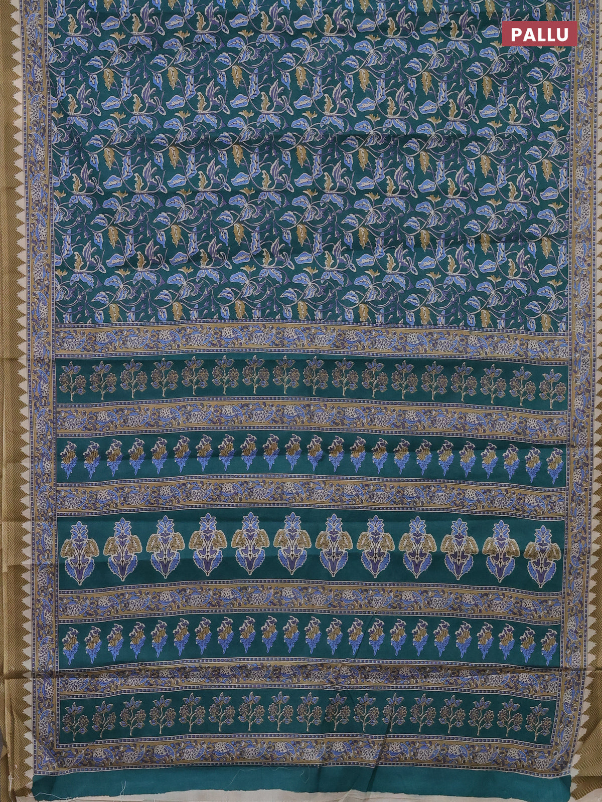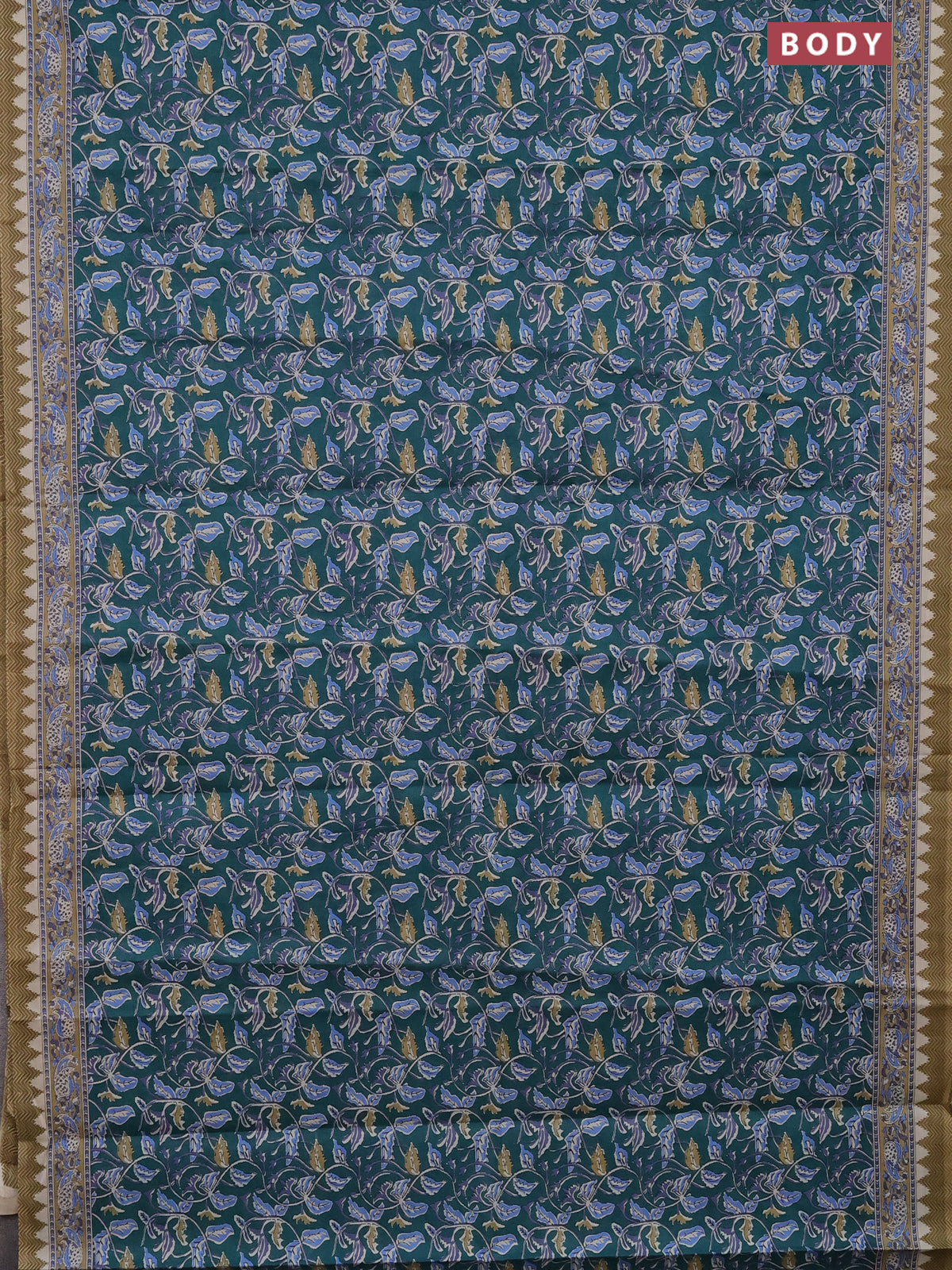 Muslin cotton saree peacock green with kalamkari prints and printed border