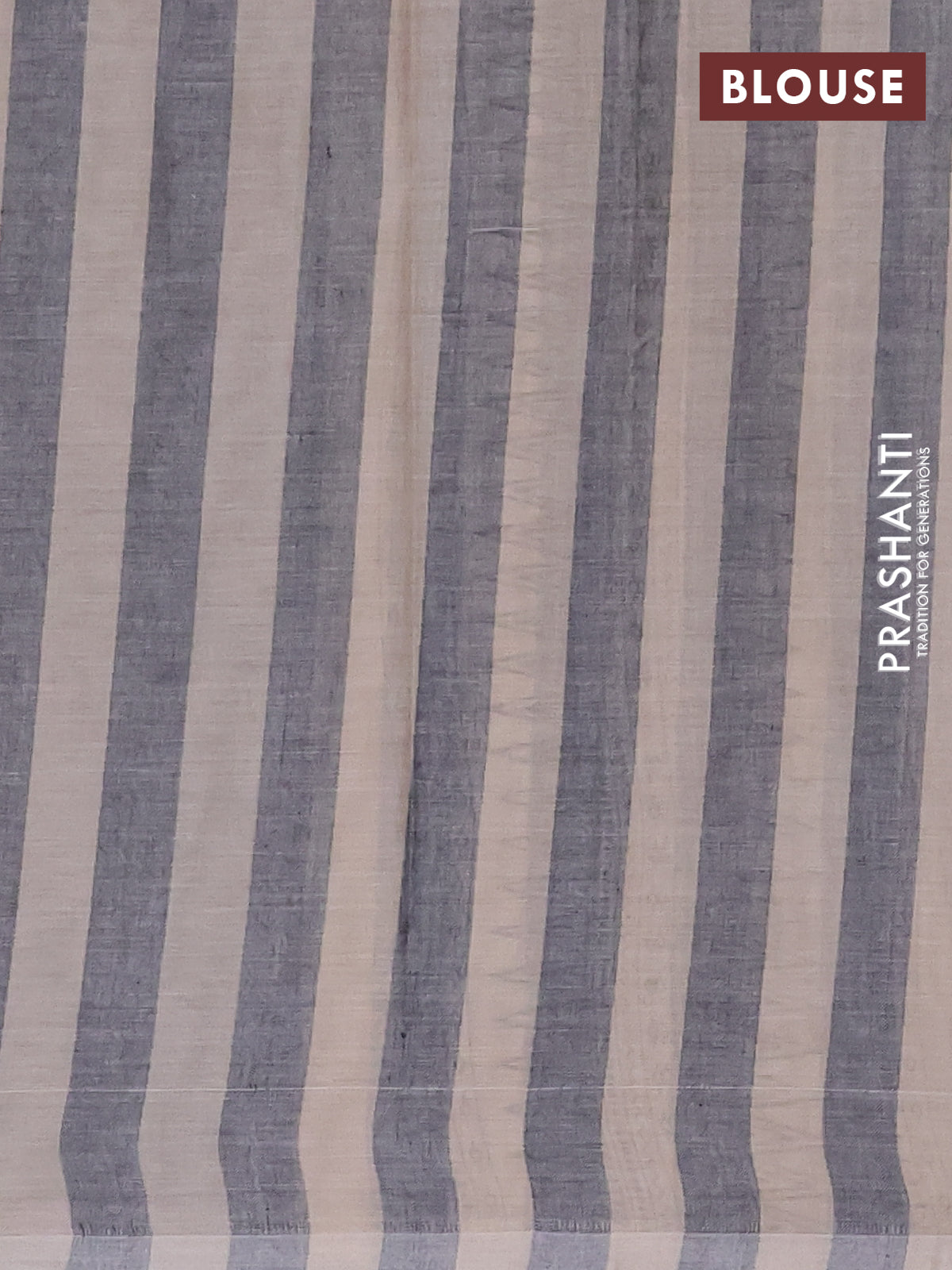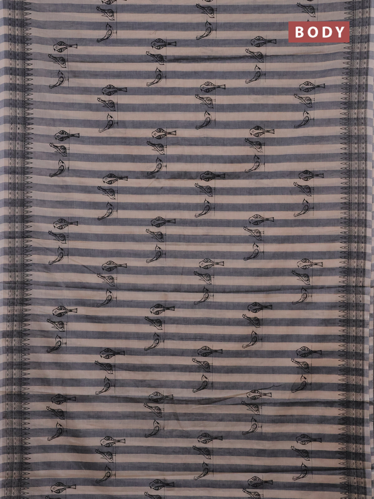 Narayanpet cotton block printed saree beige grey with allover stripe pattern & bird butta prints and printed border