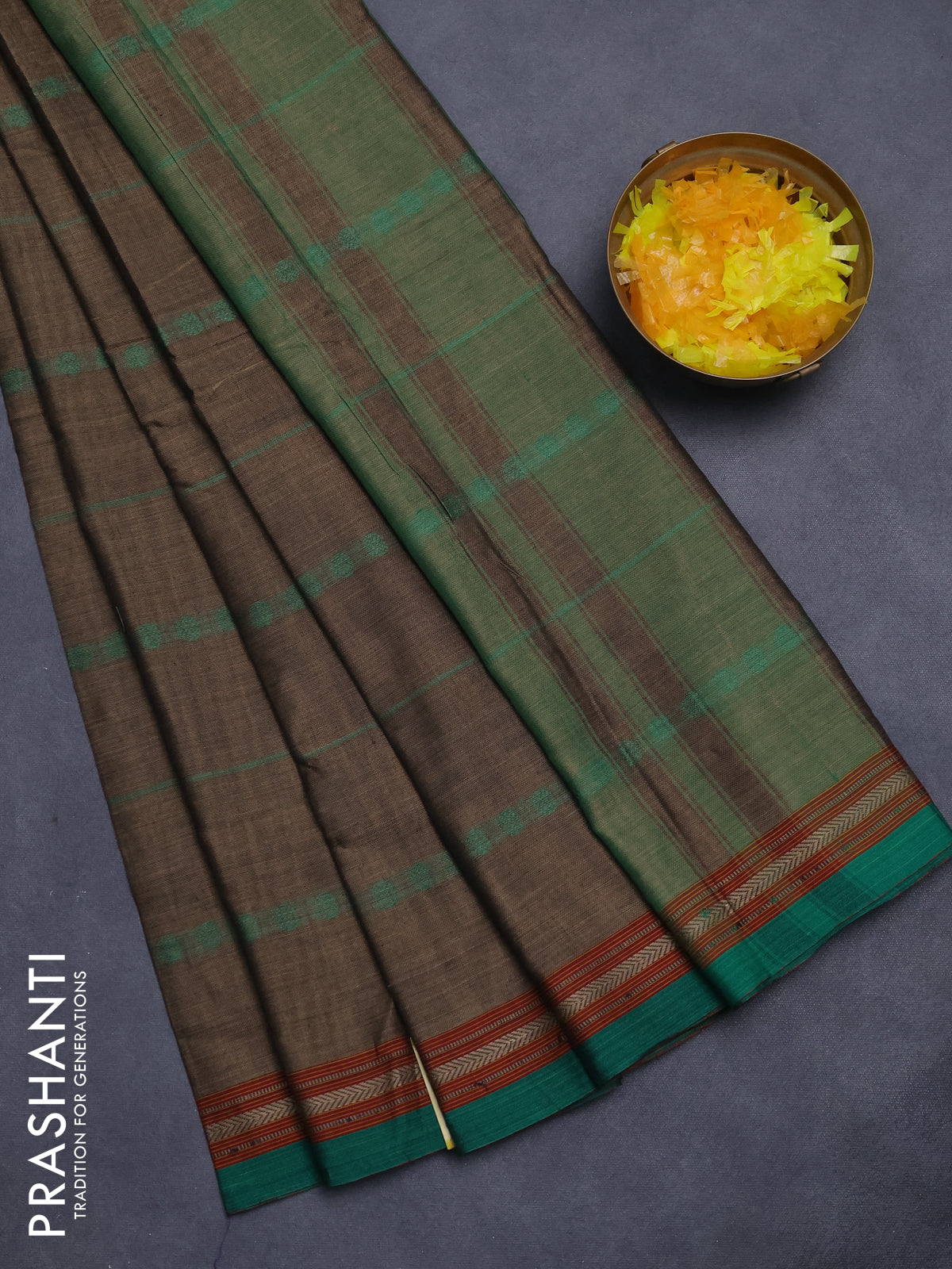 Narayanpet cotton saree chikku shade and green with allover thread weaves and thread woven border