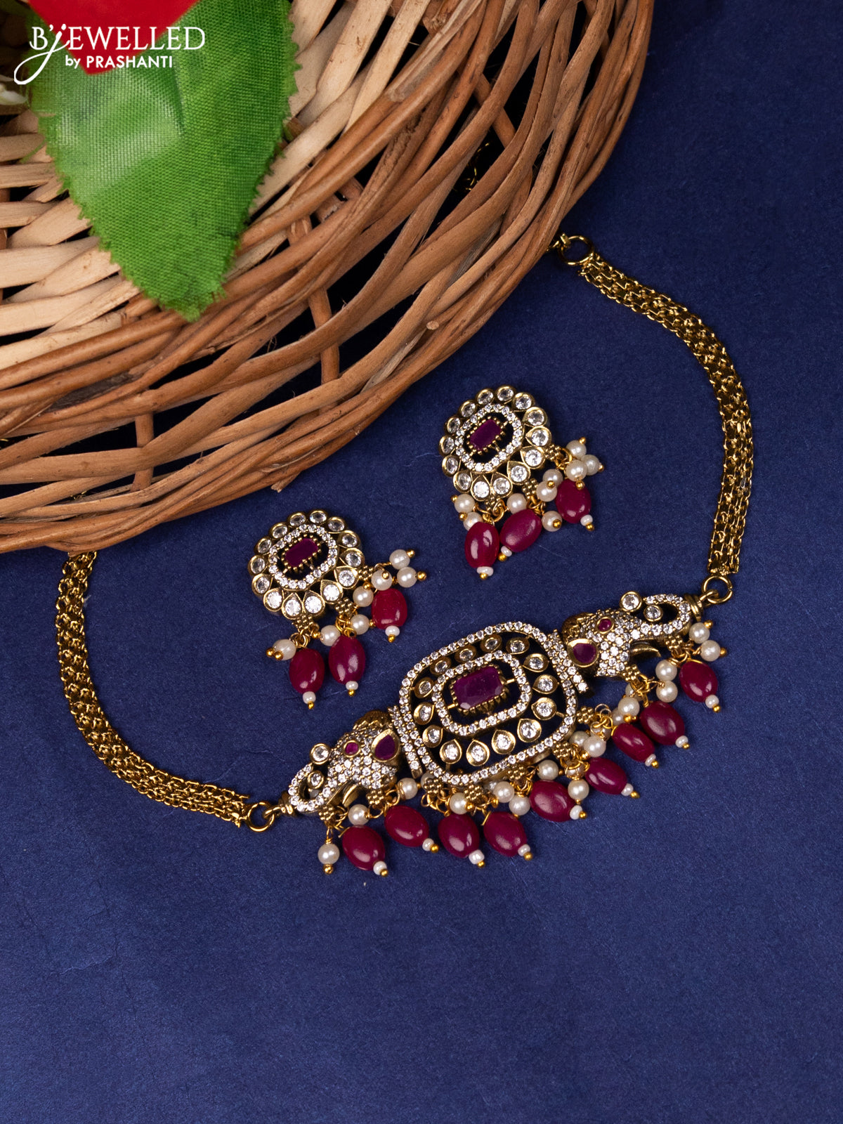 Choker elephant design with ruby & cz stones and beads hanings in victorian finish