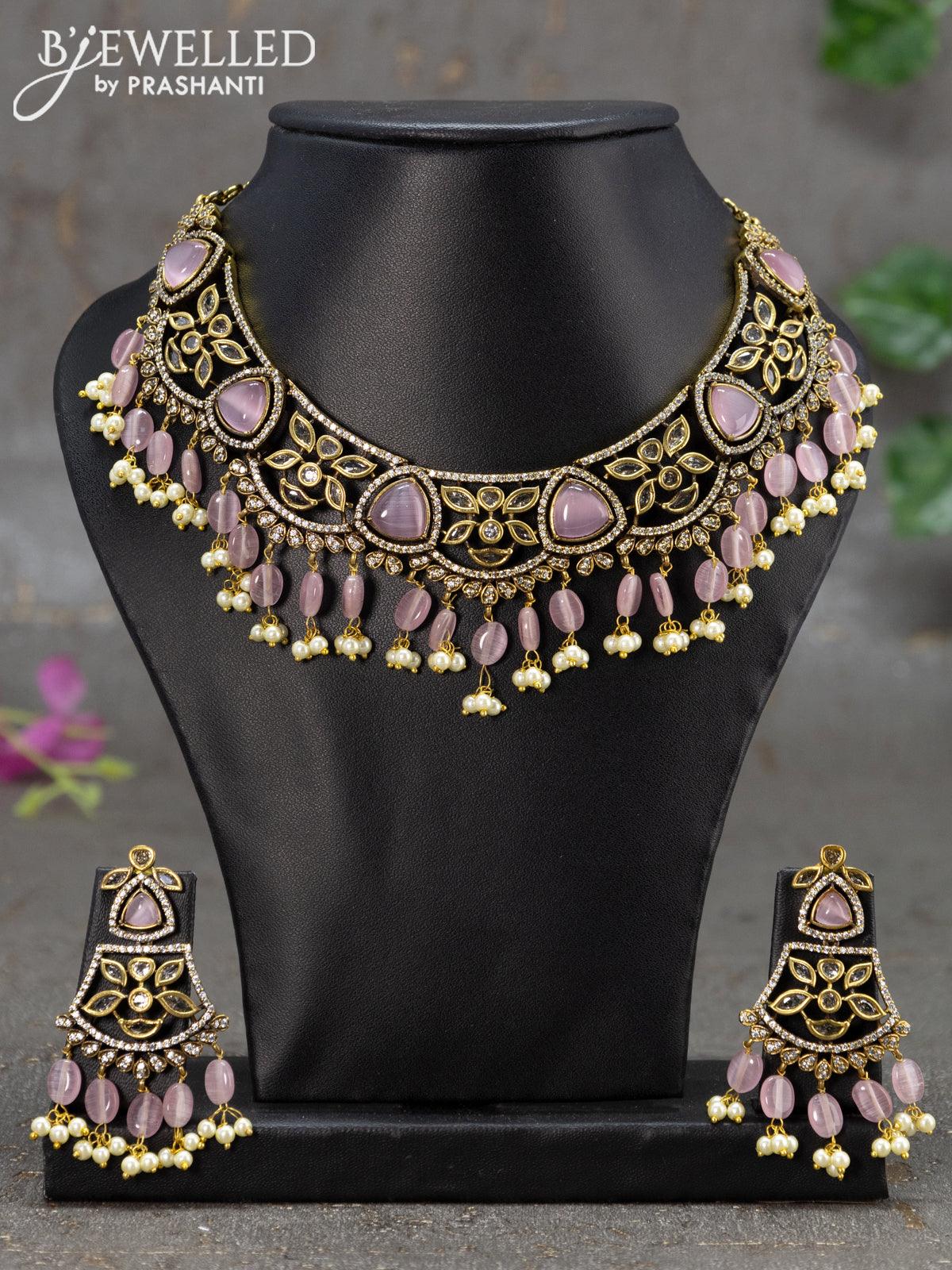 Necklace with baby pink & cz stones and beads hanging in victorian finish