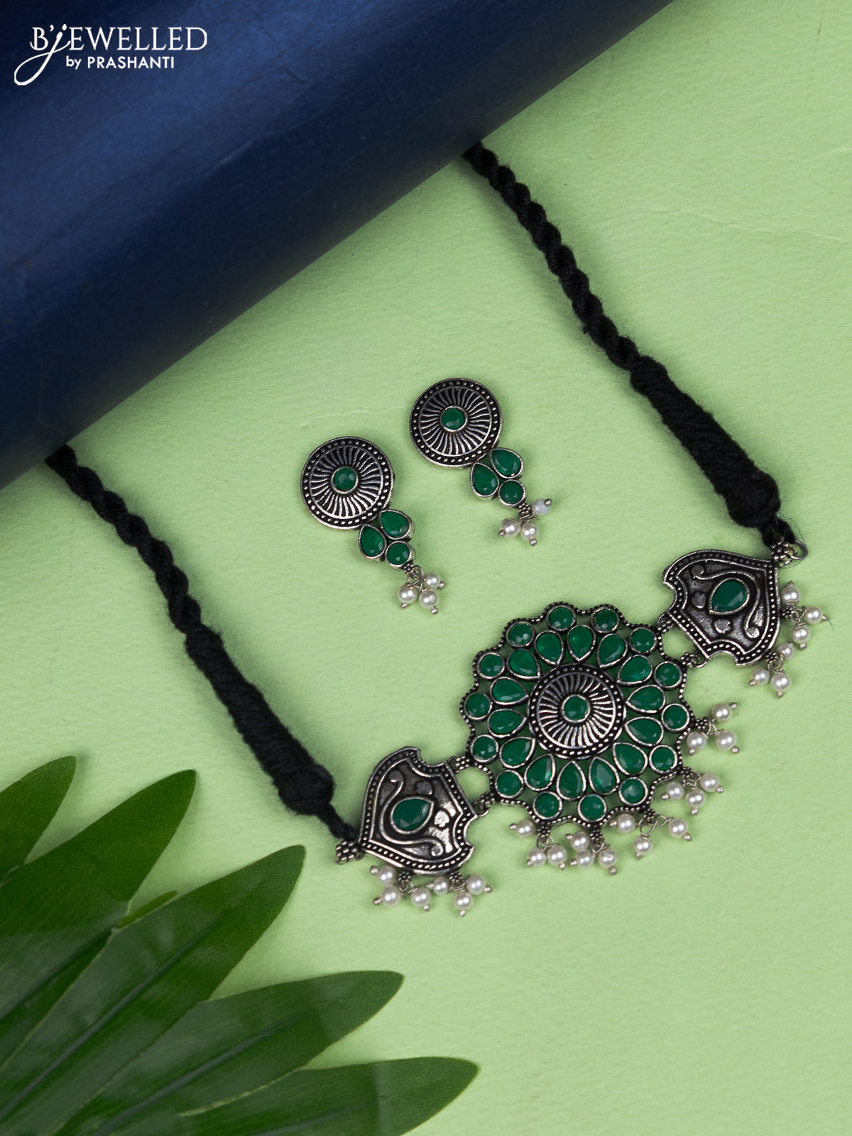 Oxidised choker peacock design with emerald stone and pearl hangings