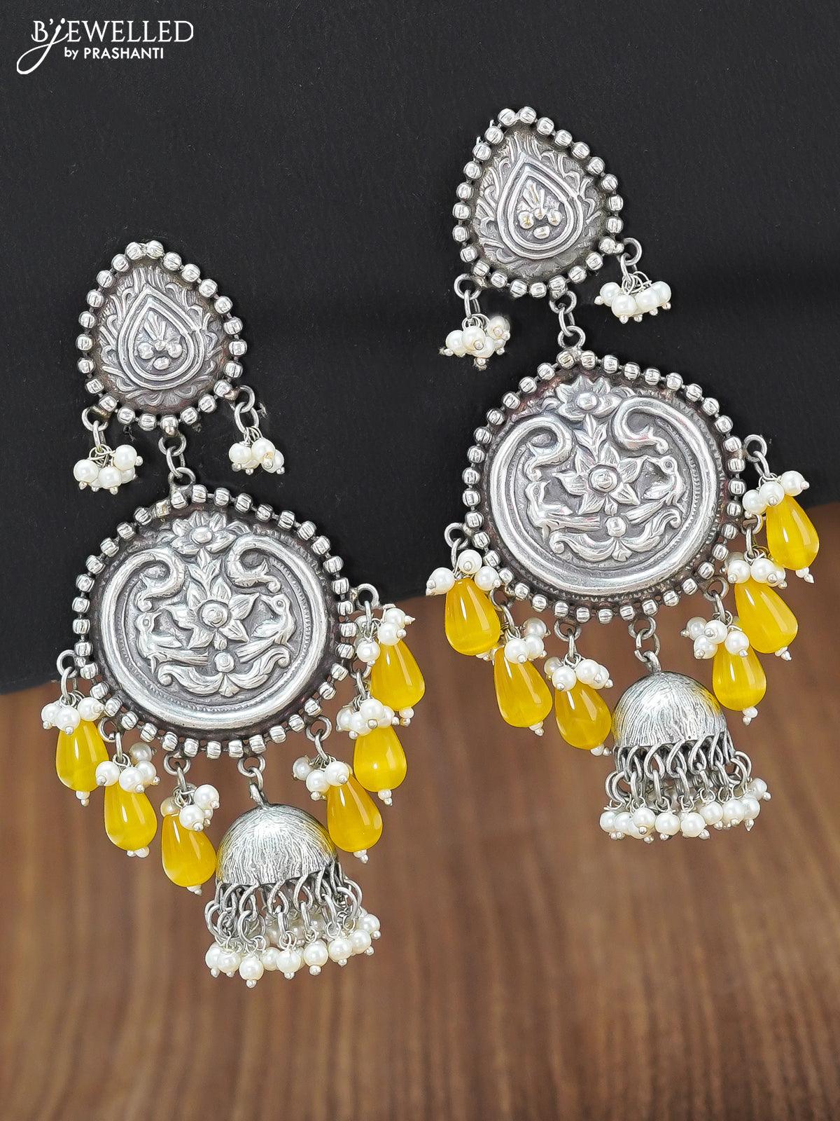 Oxidised floral design earring with yellow monalisa beads hangings