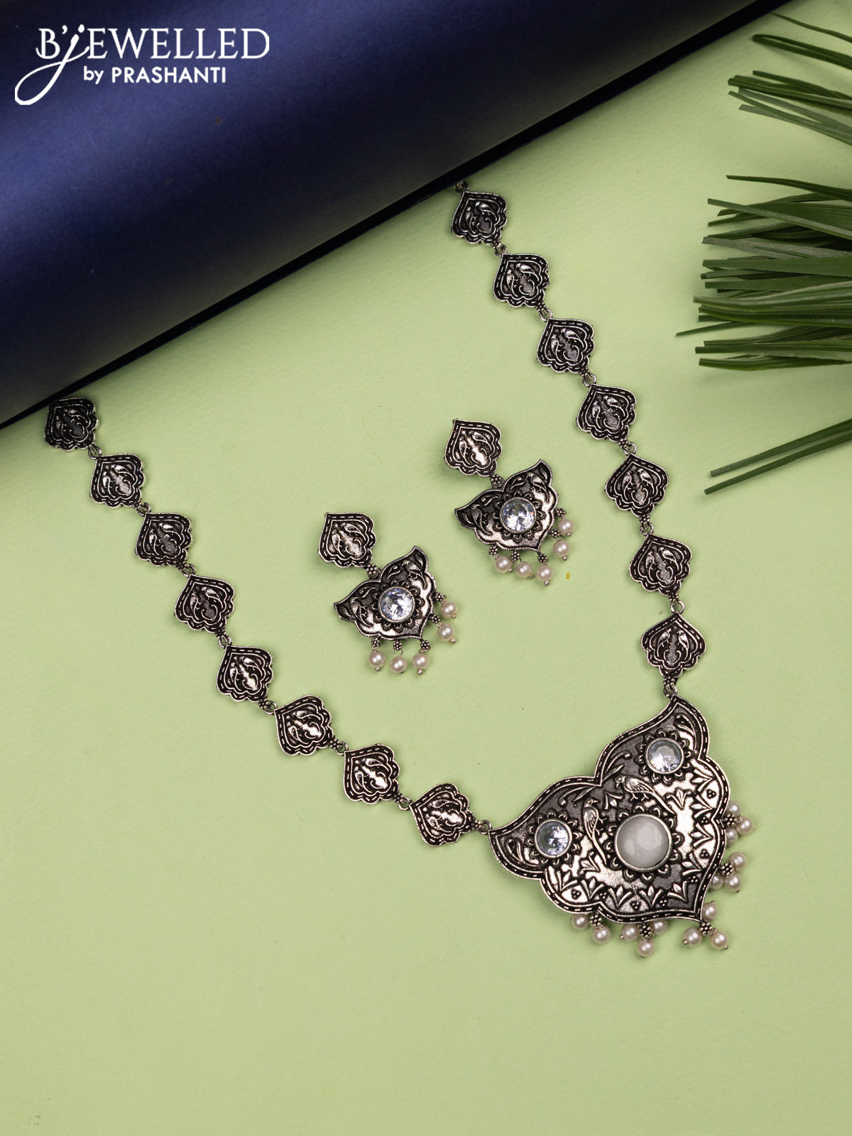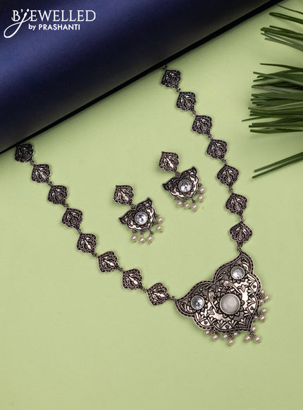 Oxidised haaram with grey & cz stones and pearl hangings