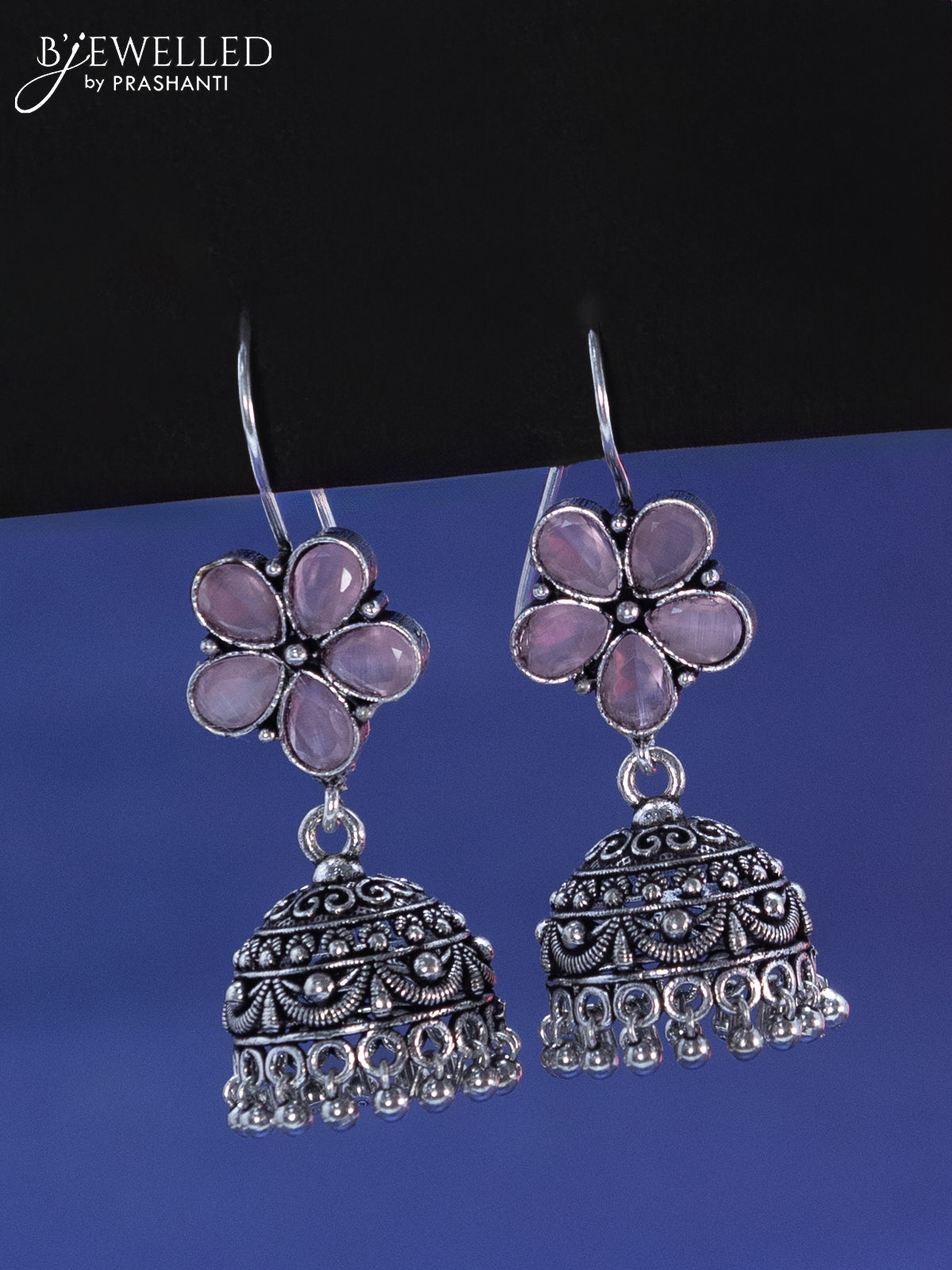 Oxidised hanging type jhumka floral design with baby pink stone and hangings