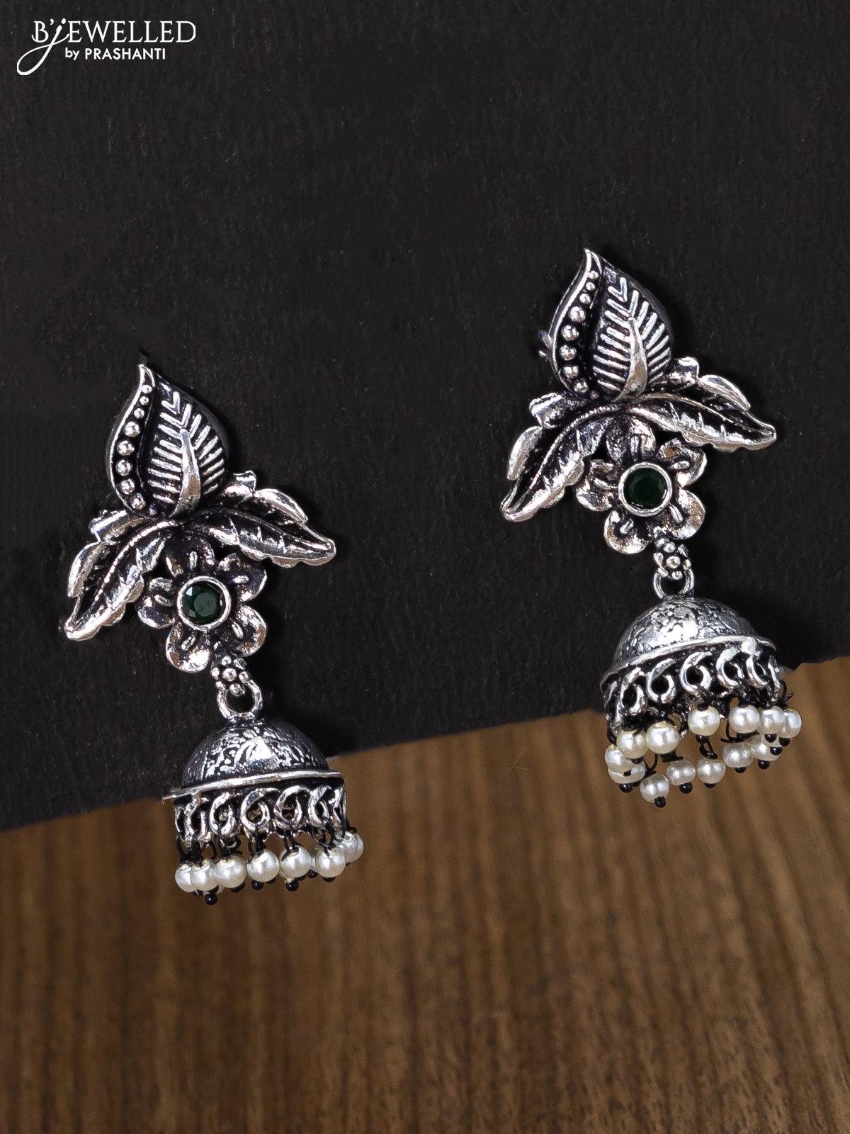 Oxidised jhumka floral & leaf design with emerald stones and pearl hangings