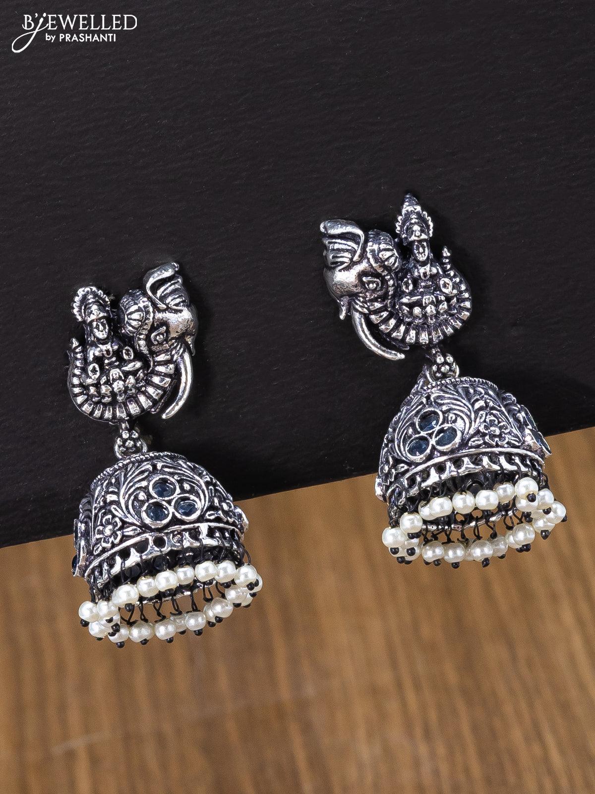 Oxidised jhumka lakshmi design with sapphire stones and pearl hangings