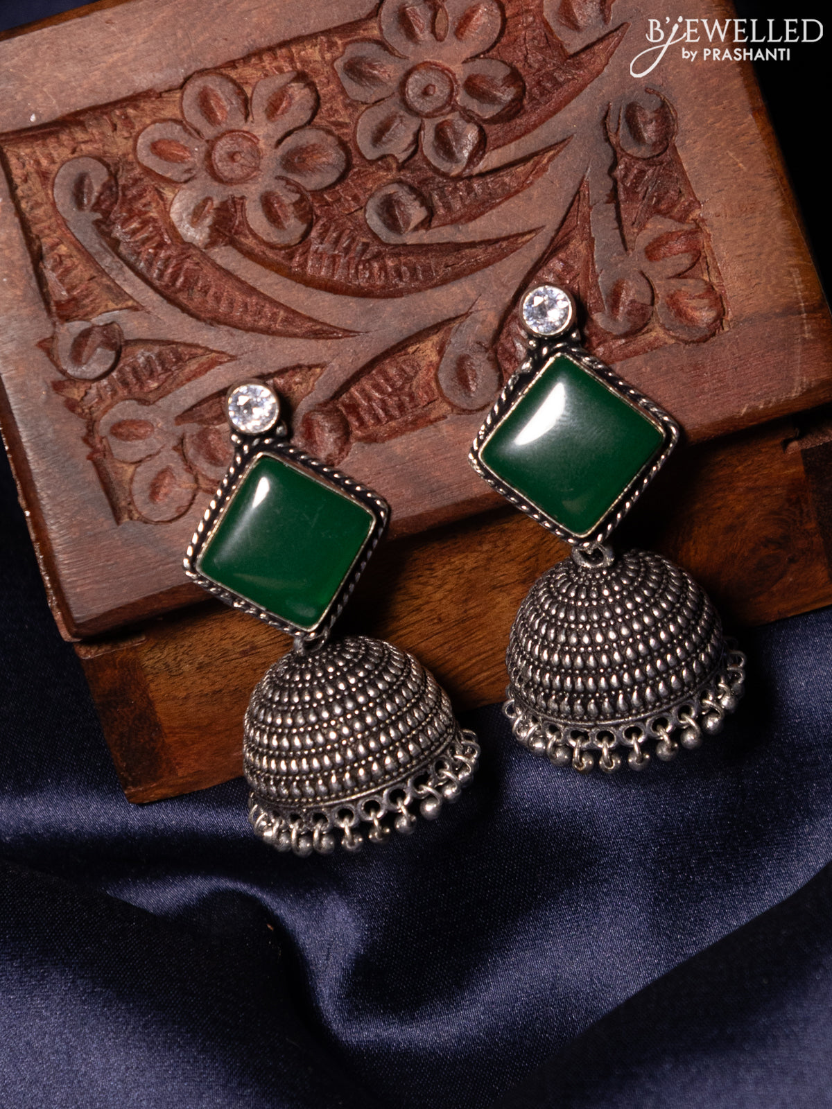 Oxidised jhumka with emerald & white stones and silver beads hanging