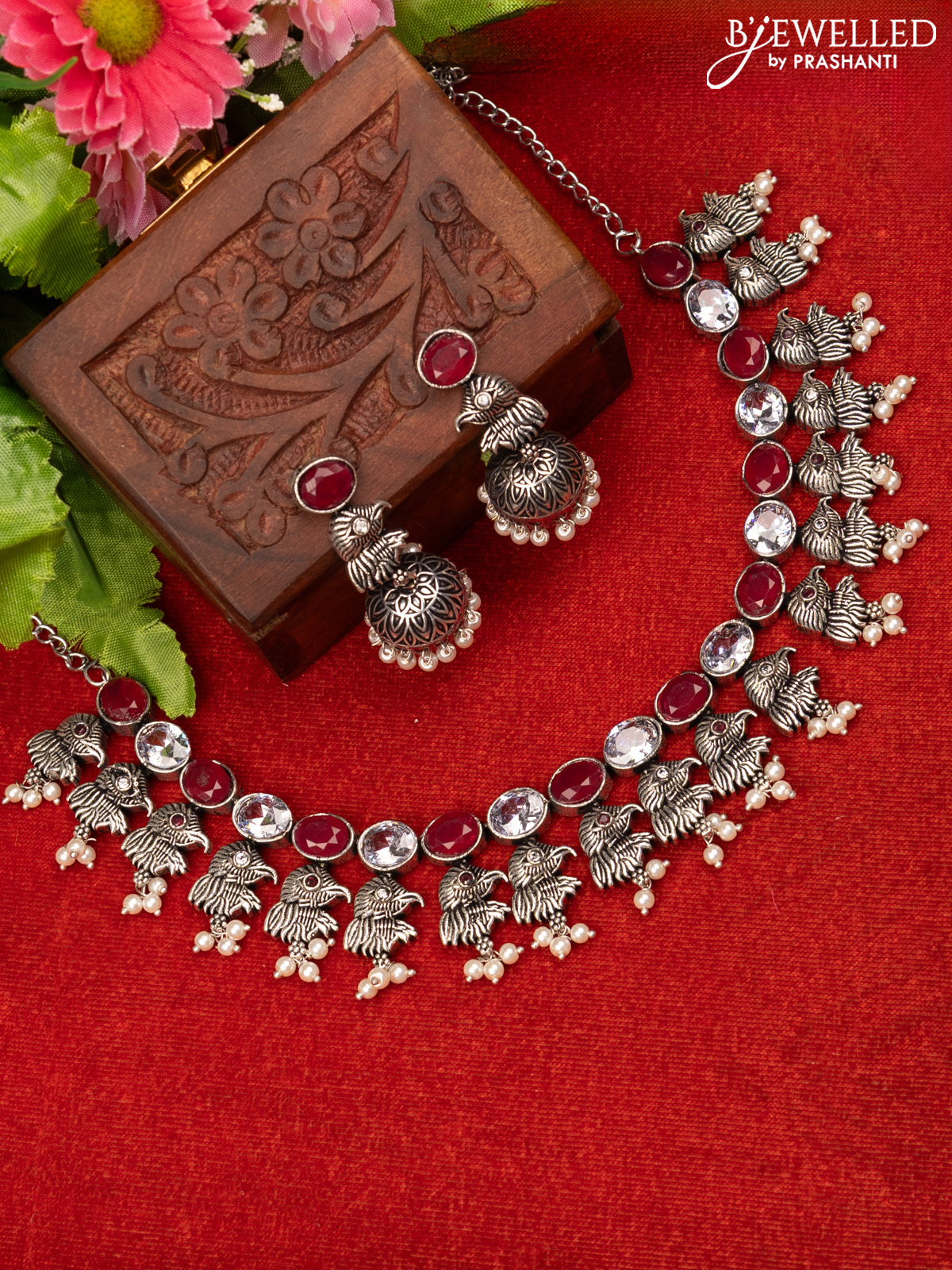 Oxidised necklace with ruby & cz stones and pearl hangings