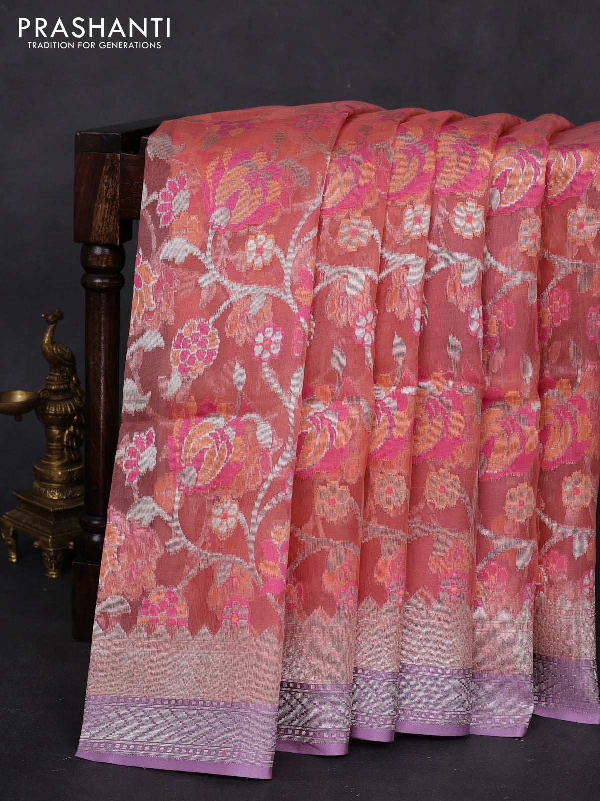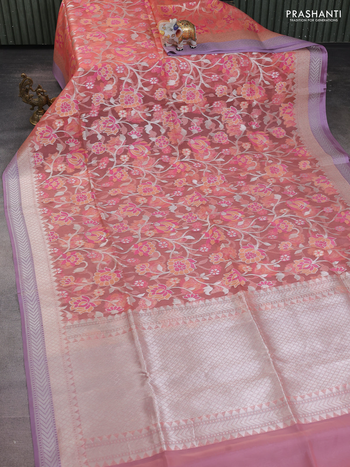 peach shade and lavender Banarasi kora jamdhani silk saree