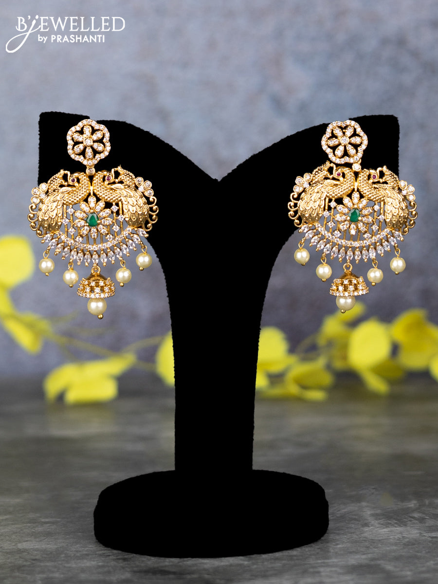 Pearl double layer haram peacock design with emerald & cz stones and pearl hangings
