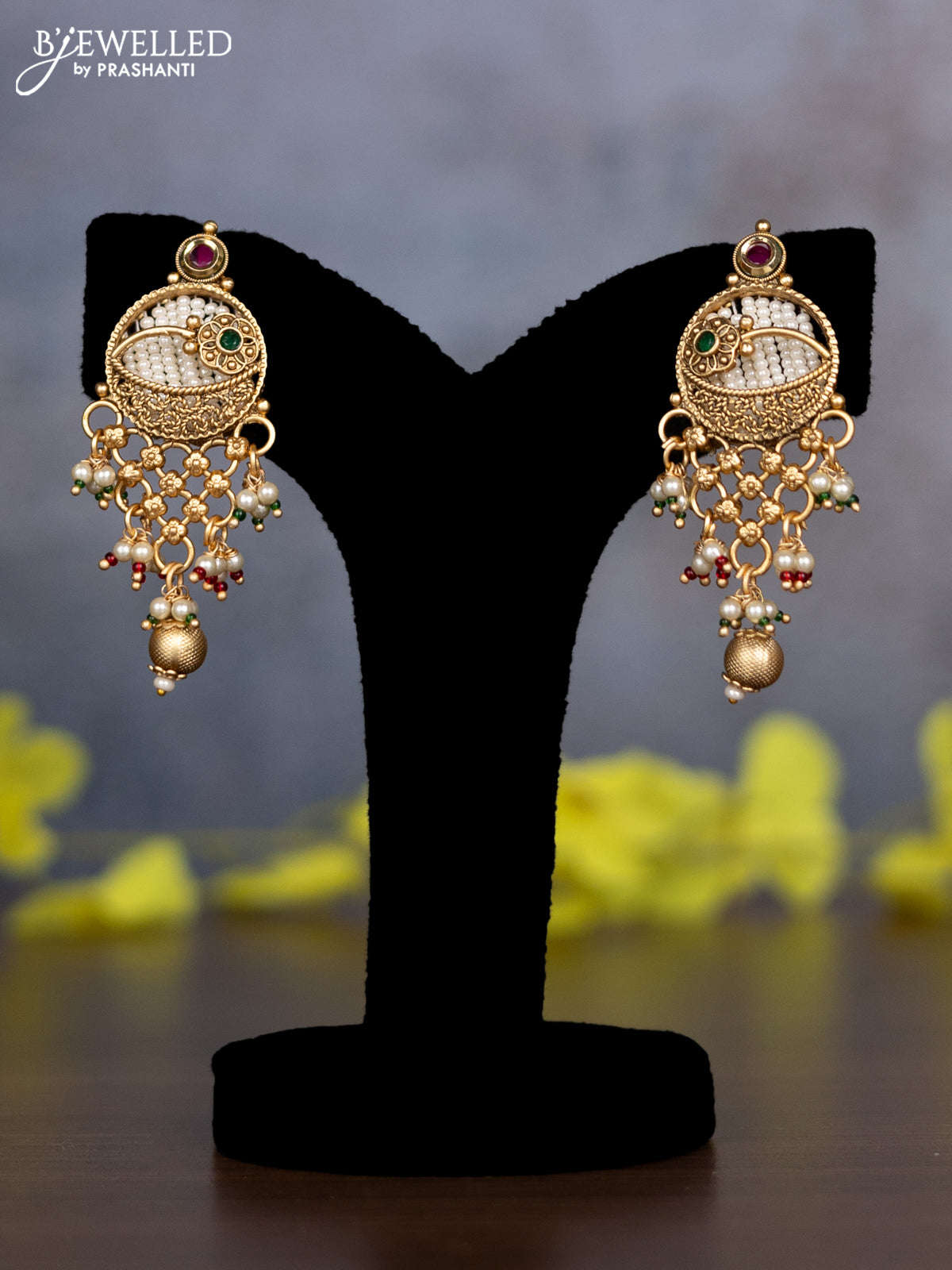 Pearl necklace floral design with kemp & cz stones and pearl & golden beads hanging