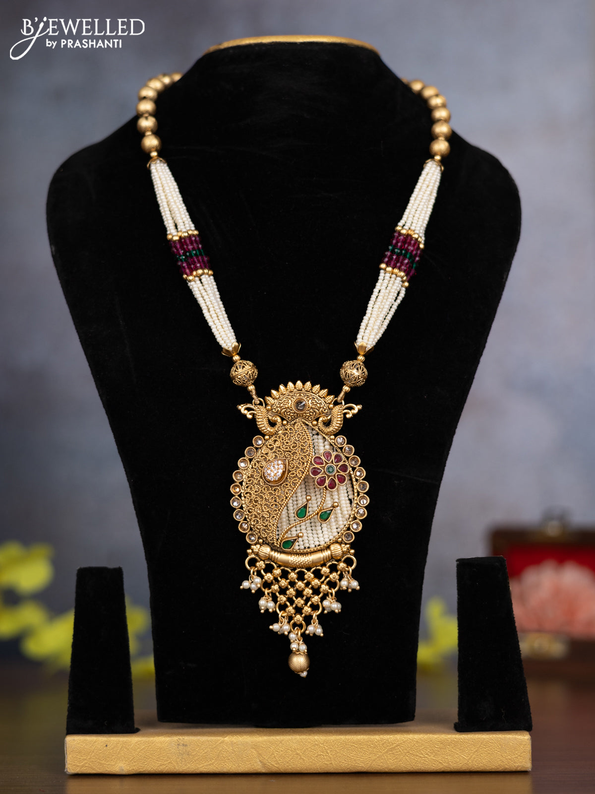 Pearl necklace floral design with kemp & cz stones and pearl & golden beads hanging without earrings