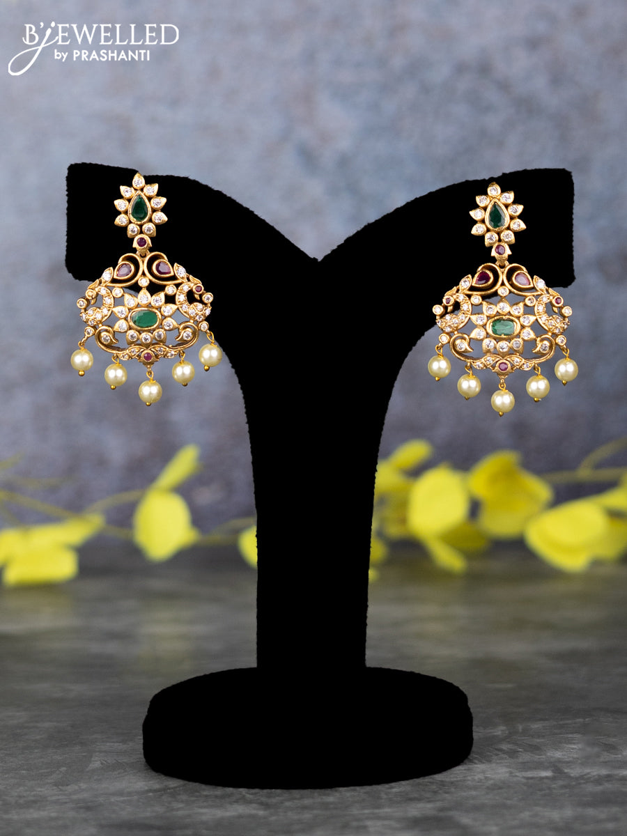 Pearl triple layer haram with kemp & cz stones and pearl beads hangings