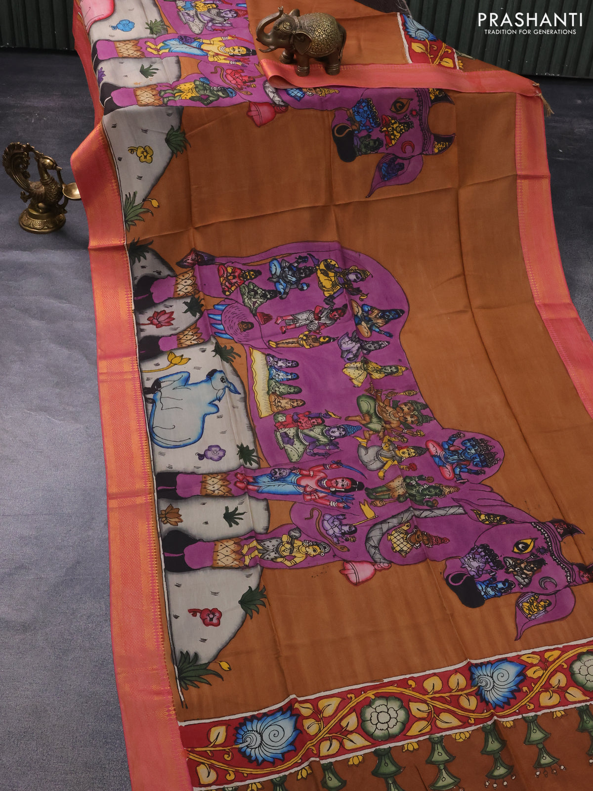 Pen kalamkari dupatta brown and peach pink shade with allover kalamkari prints and zari woven border
