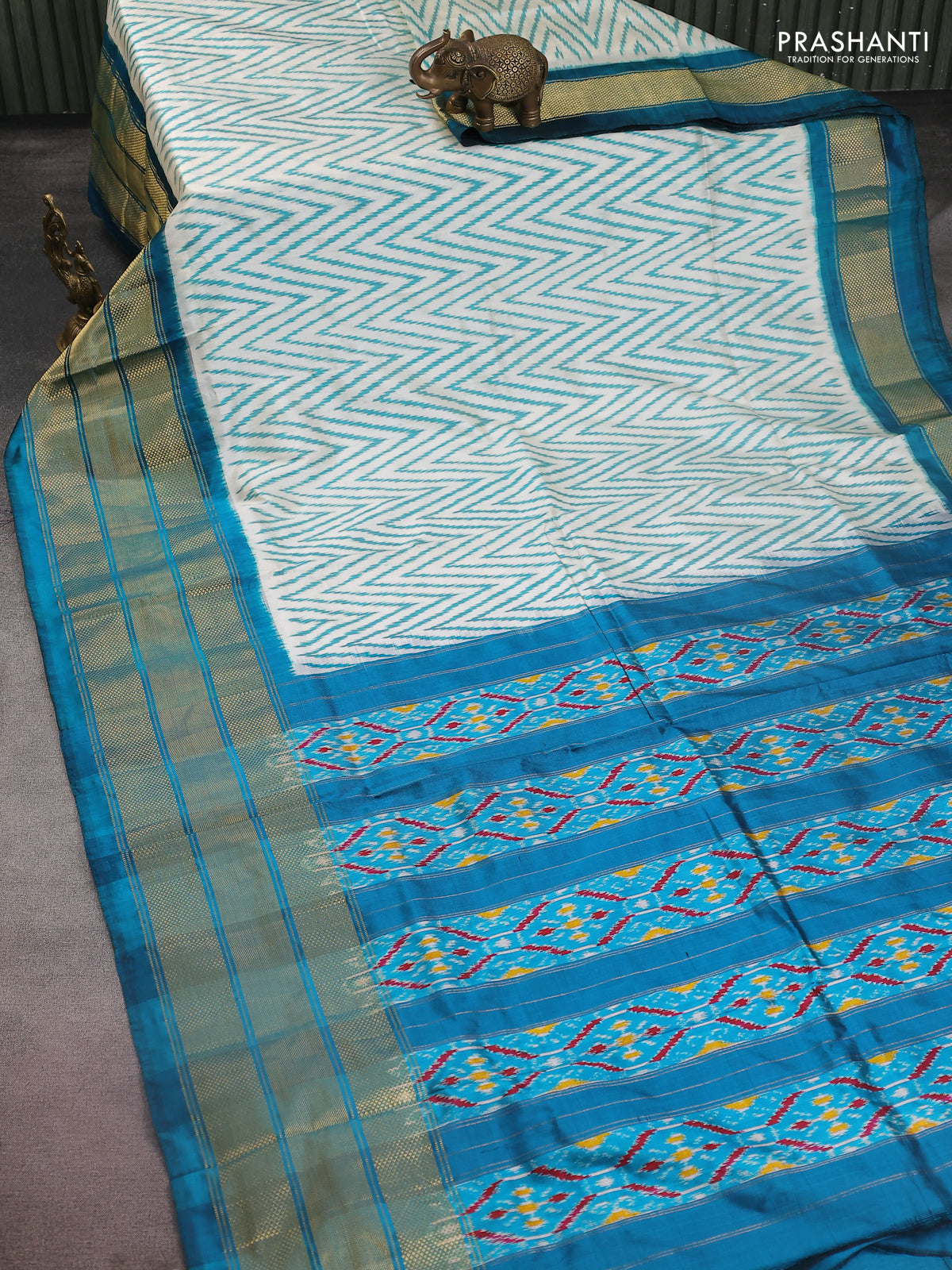 Pochampally silk saree cream and peacock green with allover zig zag ikat weaves and long zari woven border