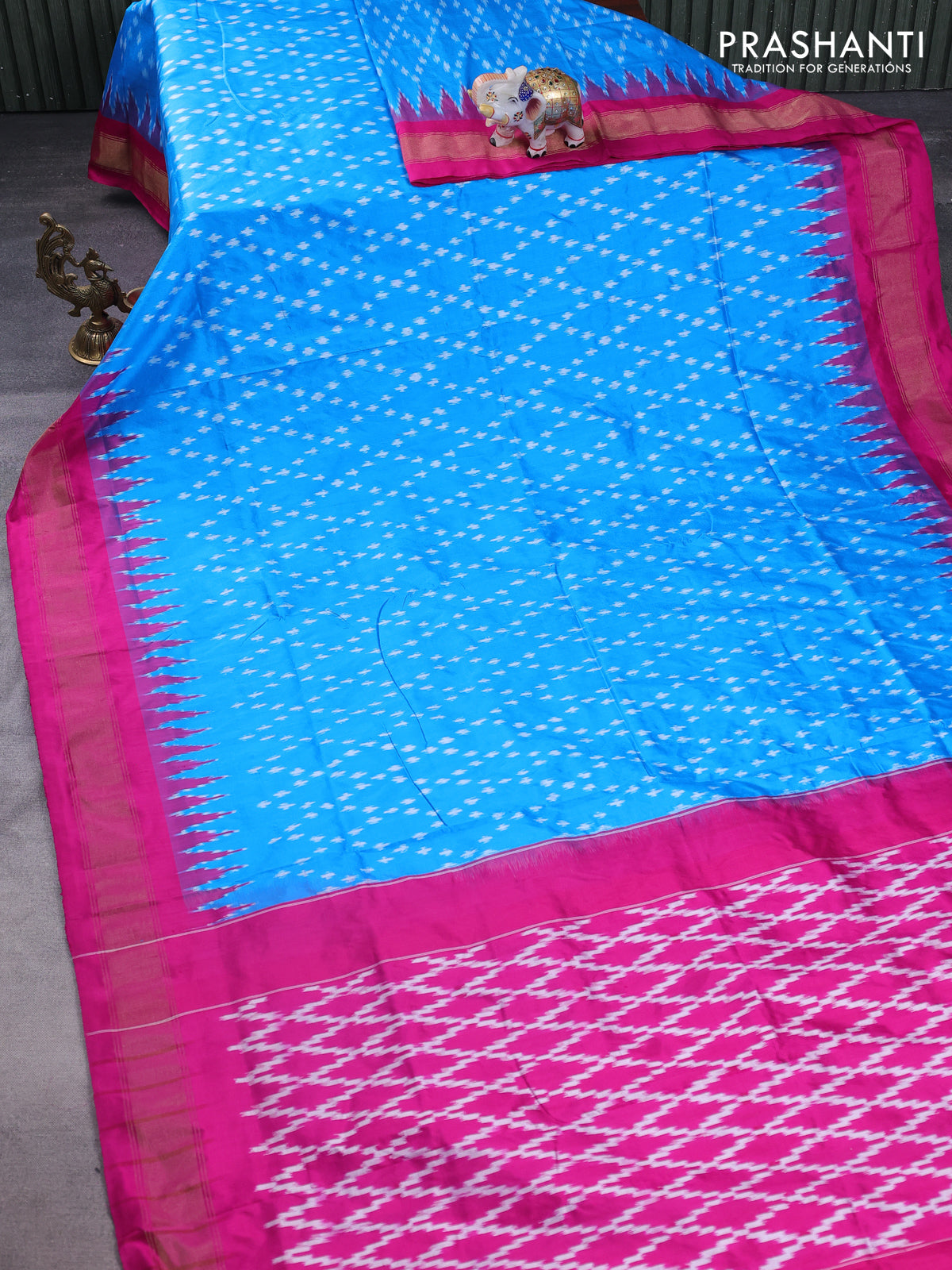 Pochampally silk saree cs blue and pink with allover zig zag ikat weaves and temple design zari woven border