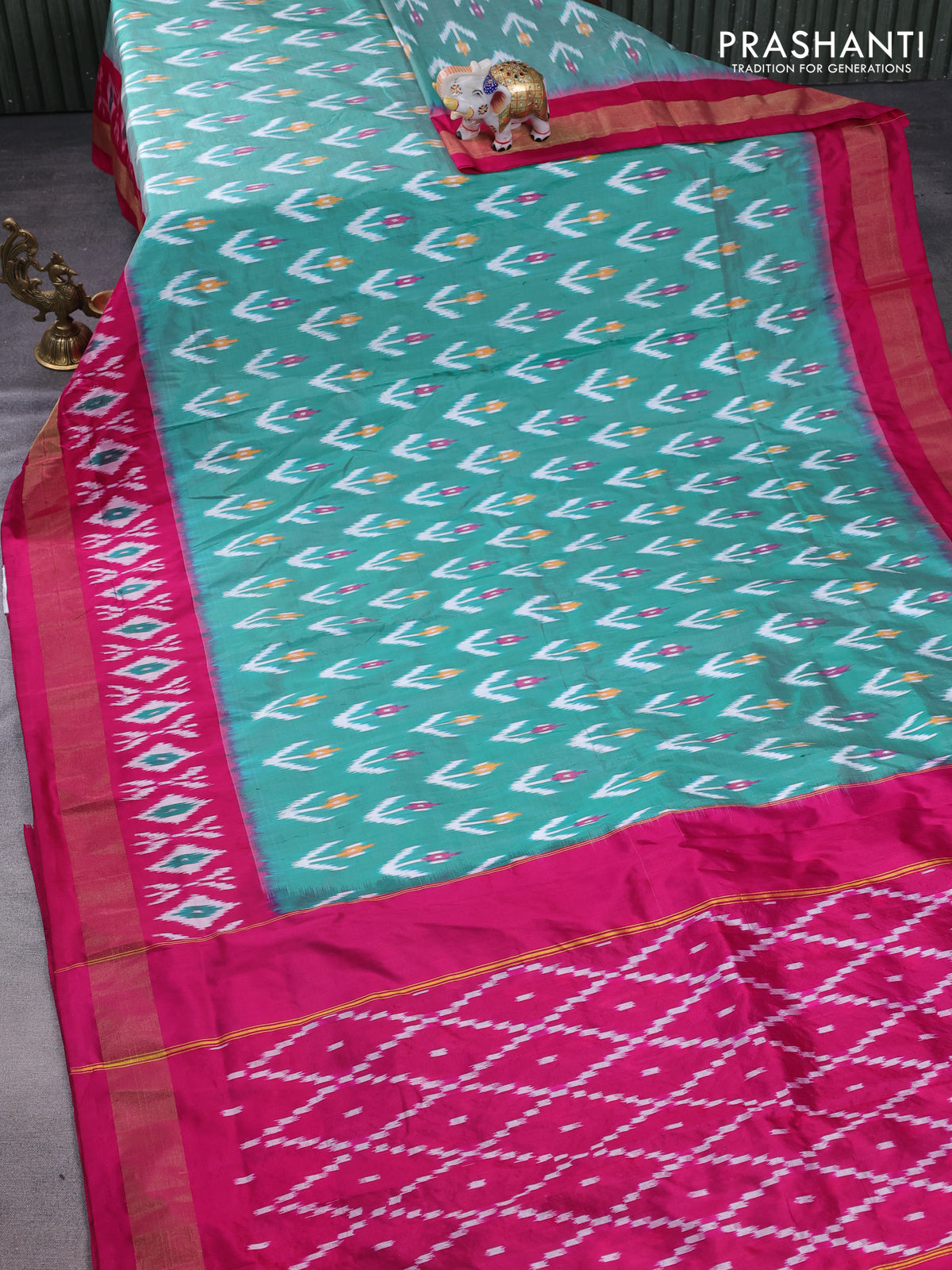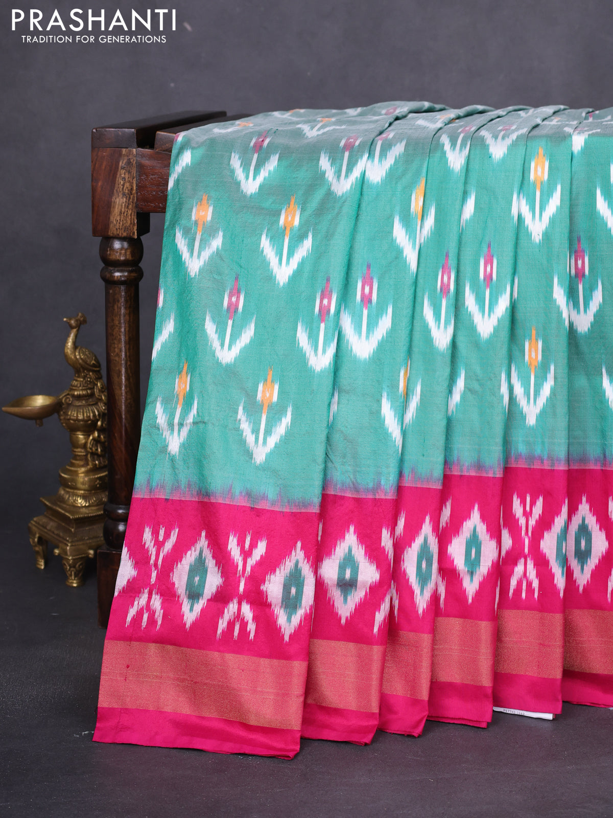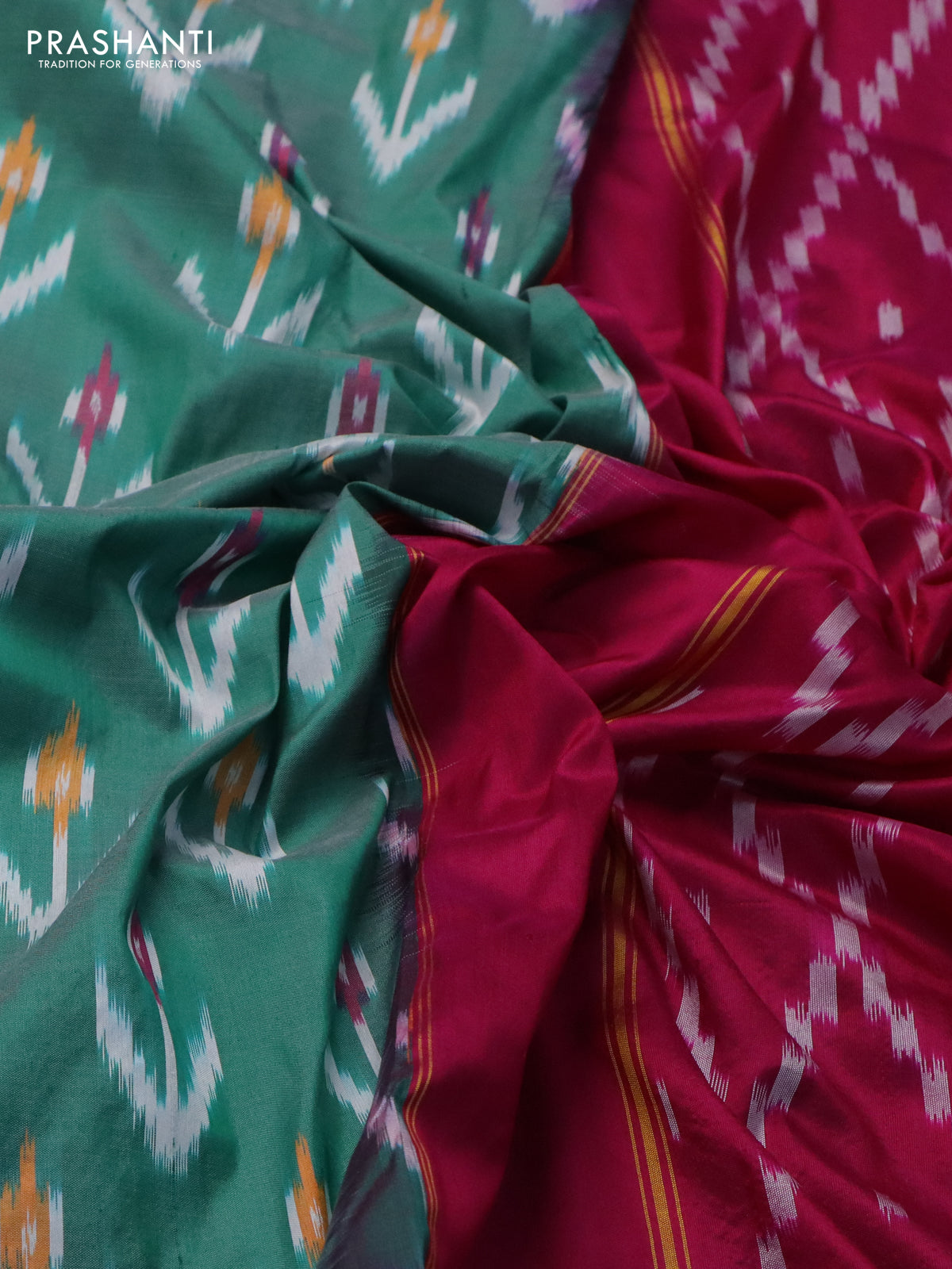 Pochampally silk saree green and dark pink with allover ikat butta weaves and long ikat woven zari border