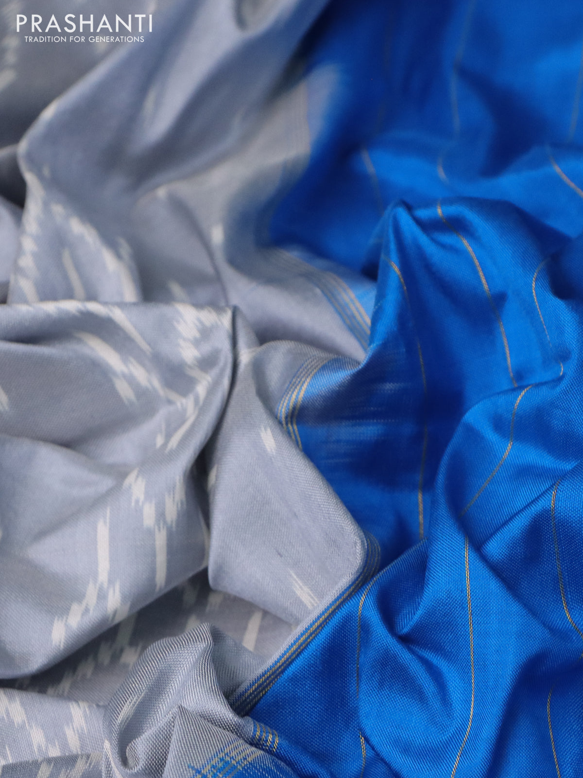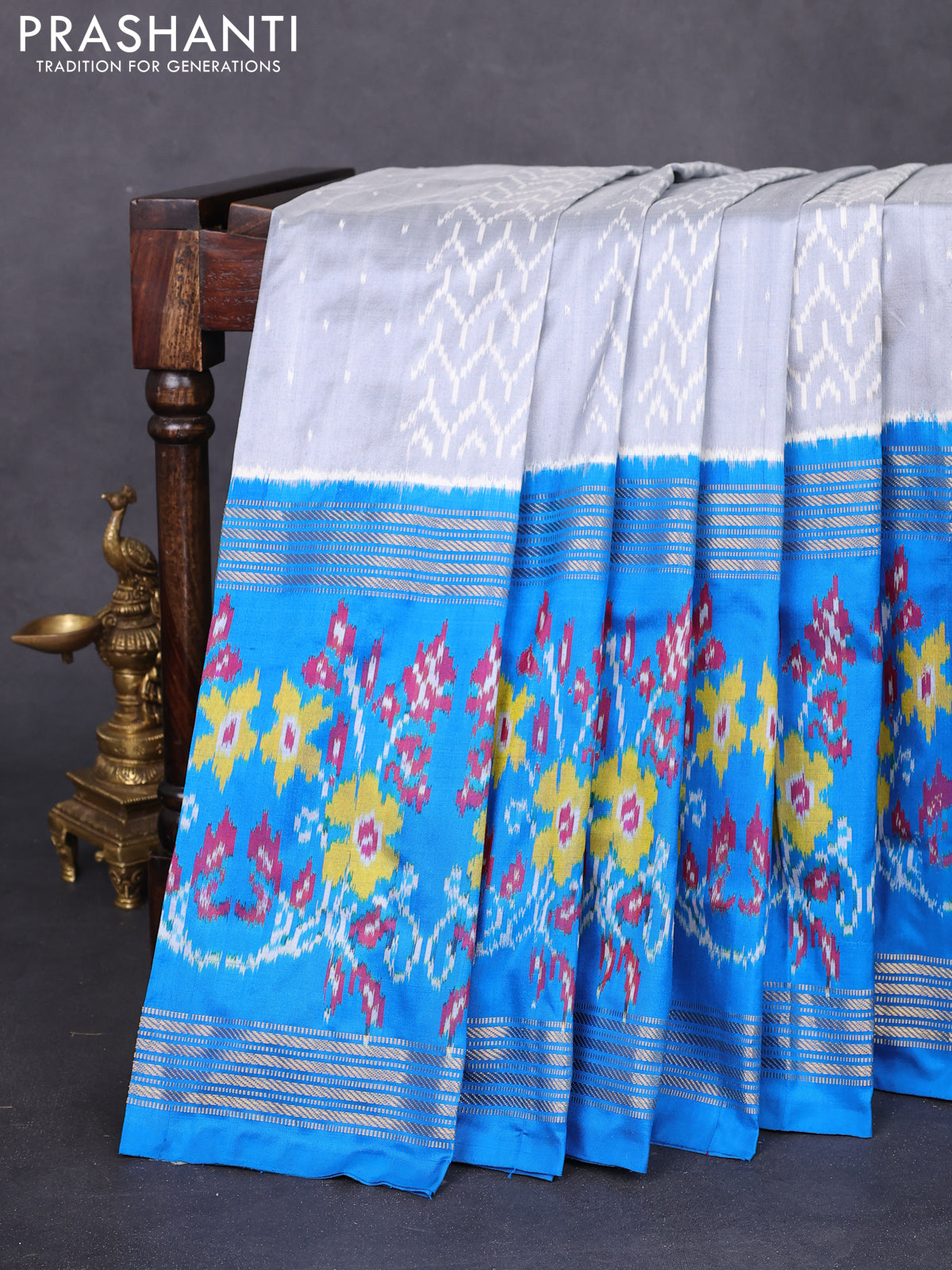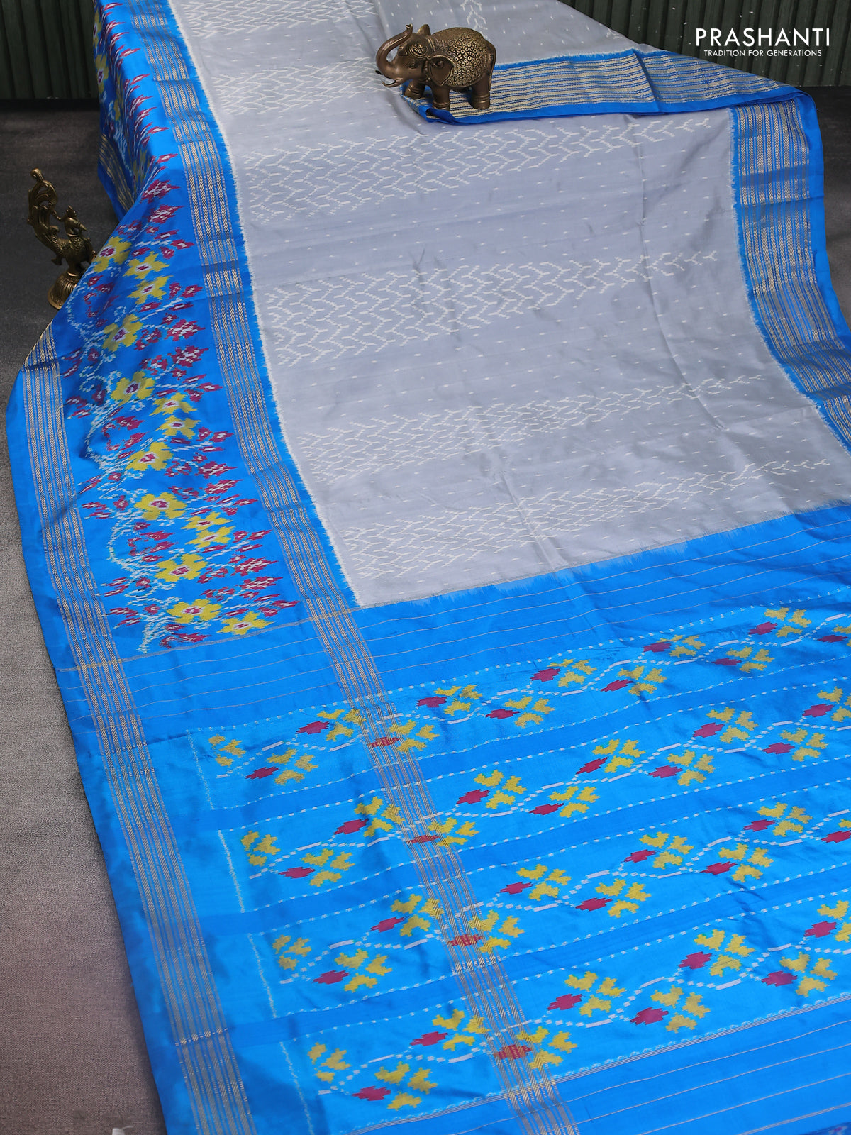 Pochampally silk saree grey and cs blue with allover ikat weaves and long ikat woven zari border