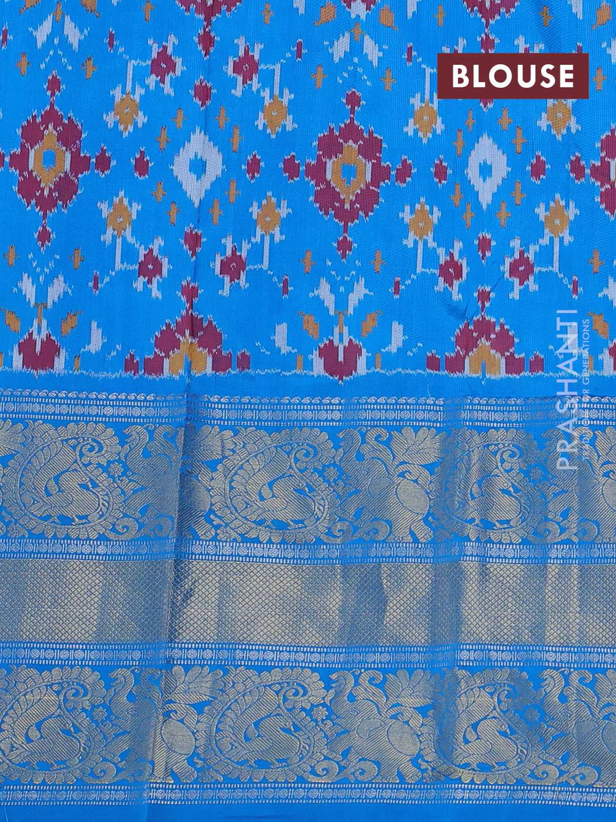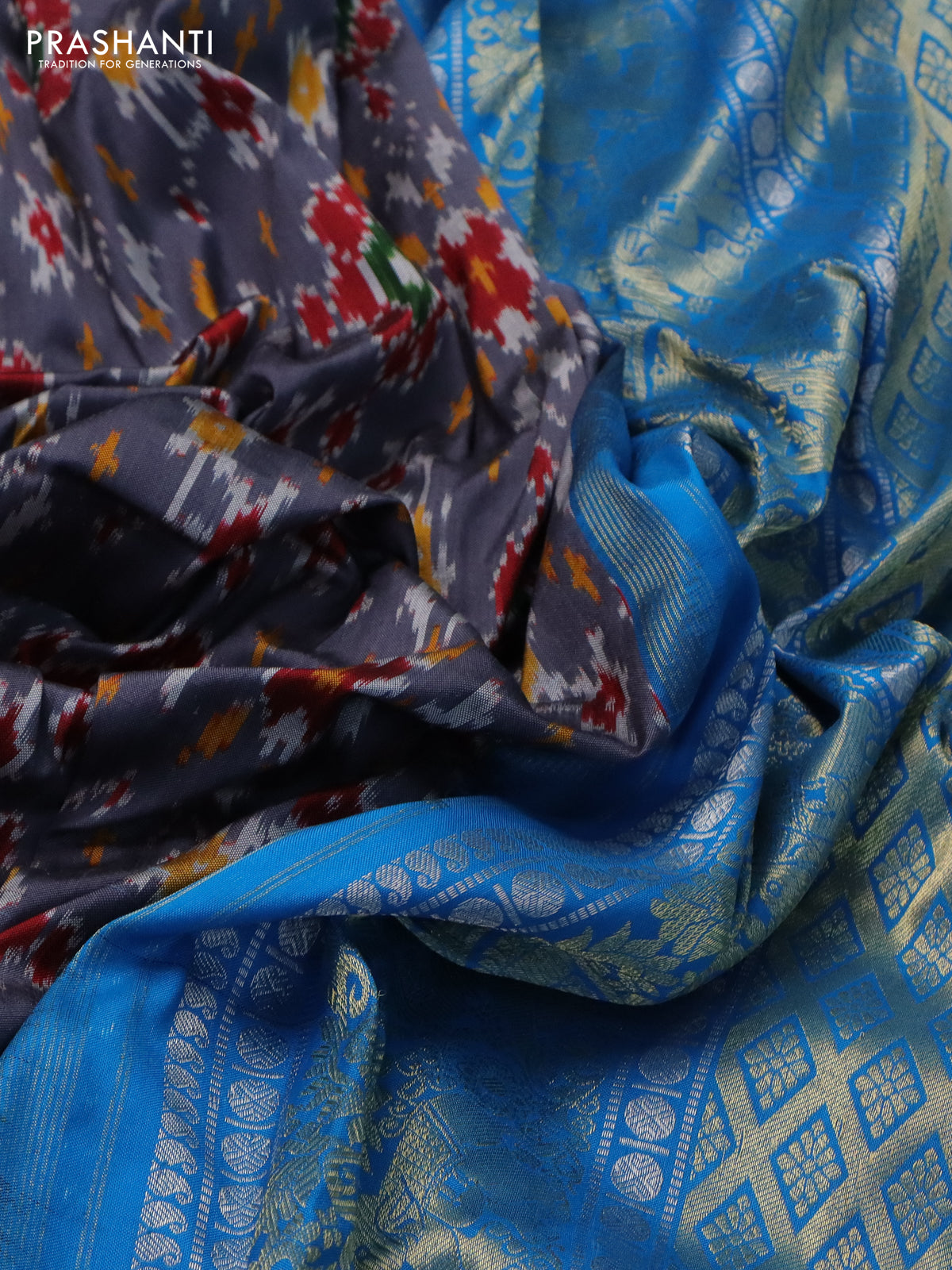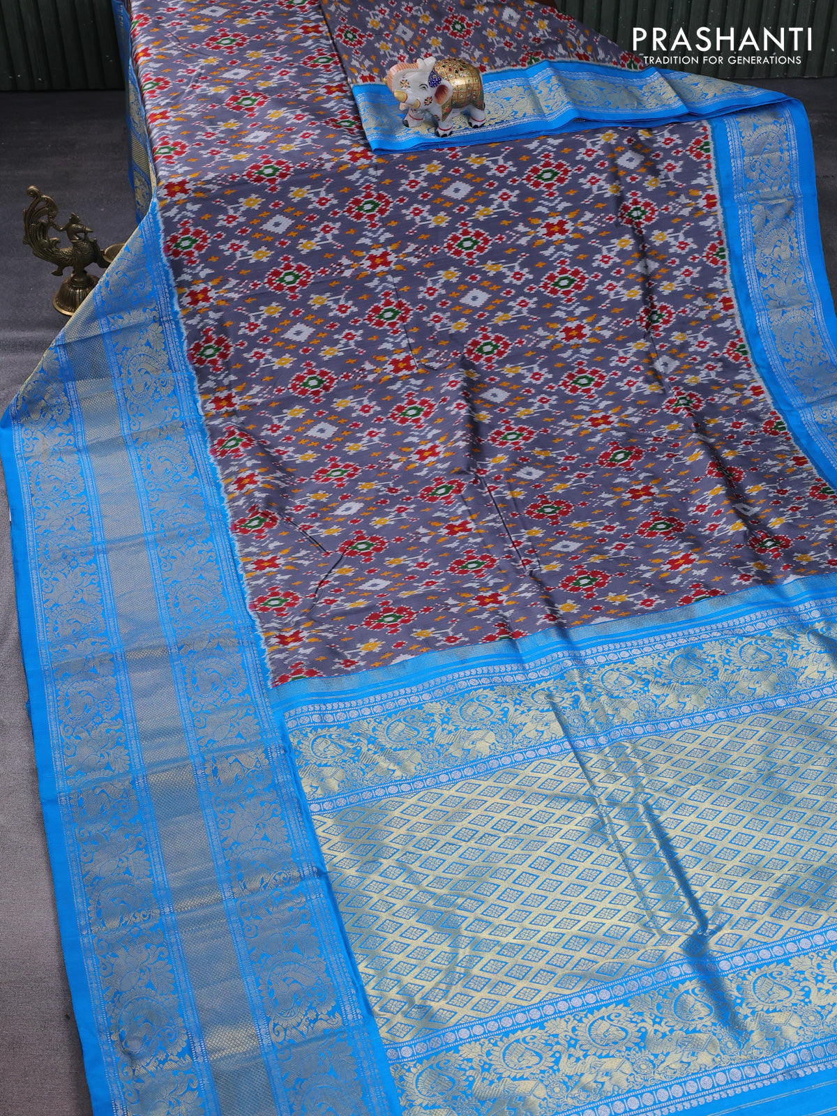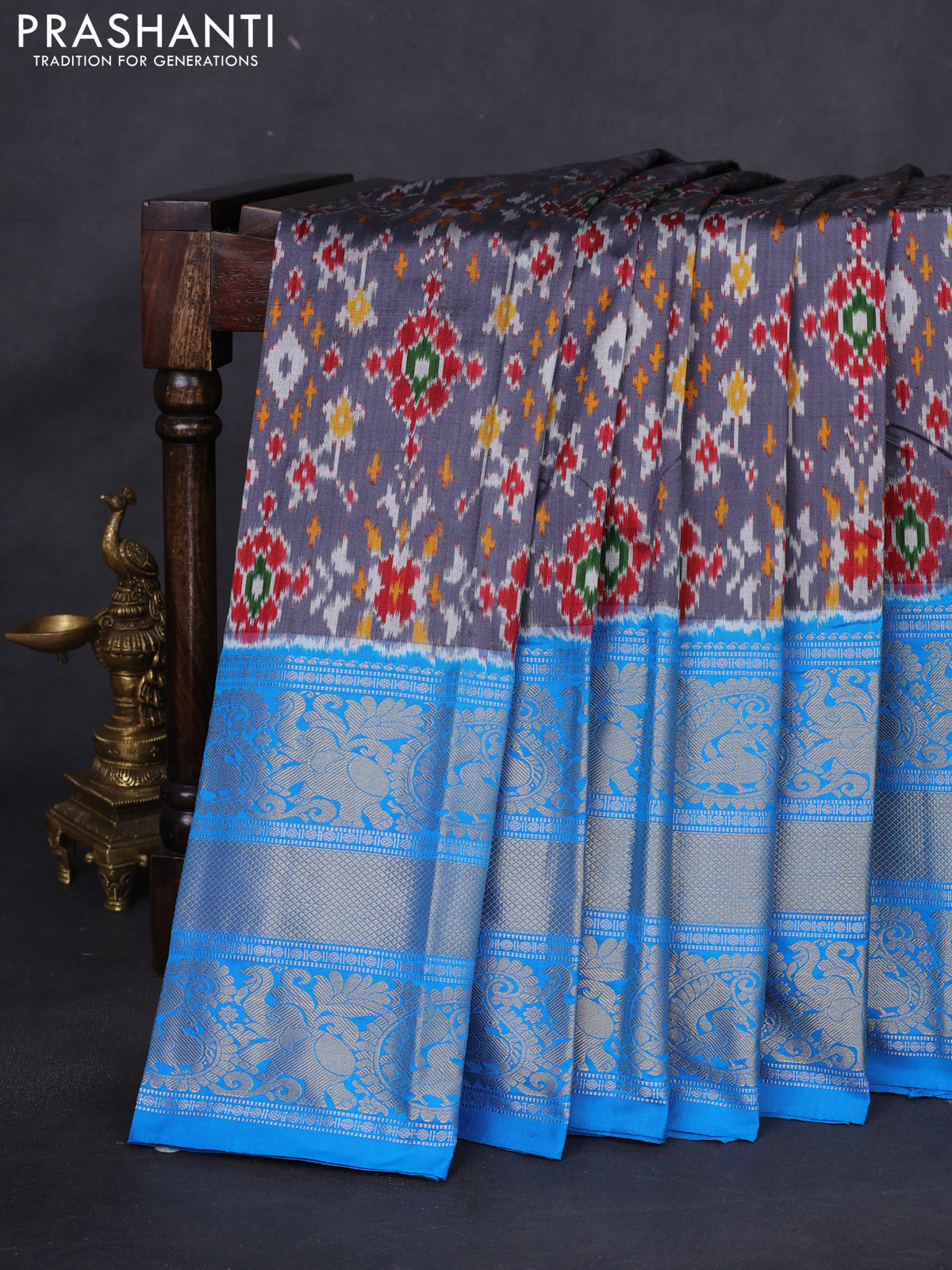 Pochampally silk saree grey and cs blue with allover ikat weaves and long silver & gold zari woven border