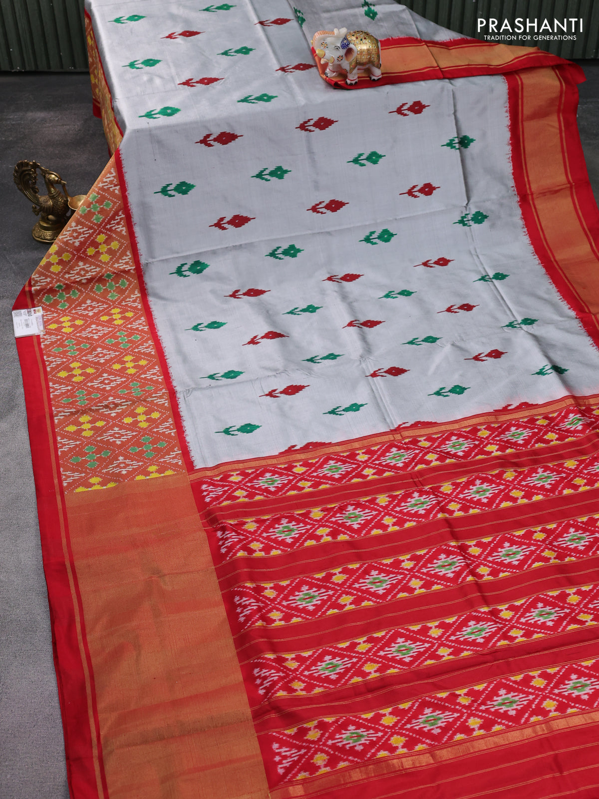 Pochampally silk saree grey and red with ikat butta weaves and long ikat woven border