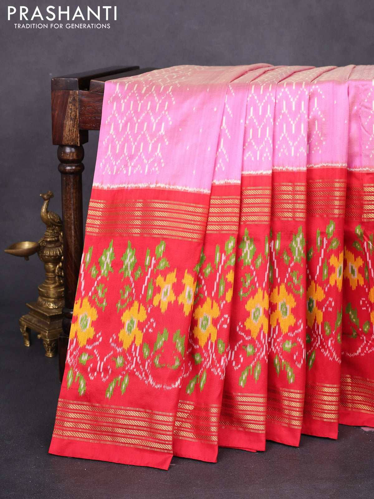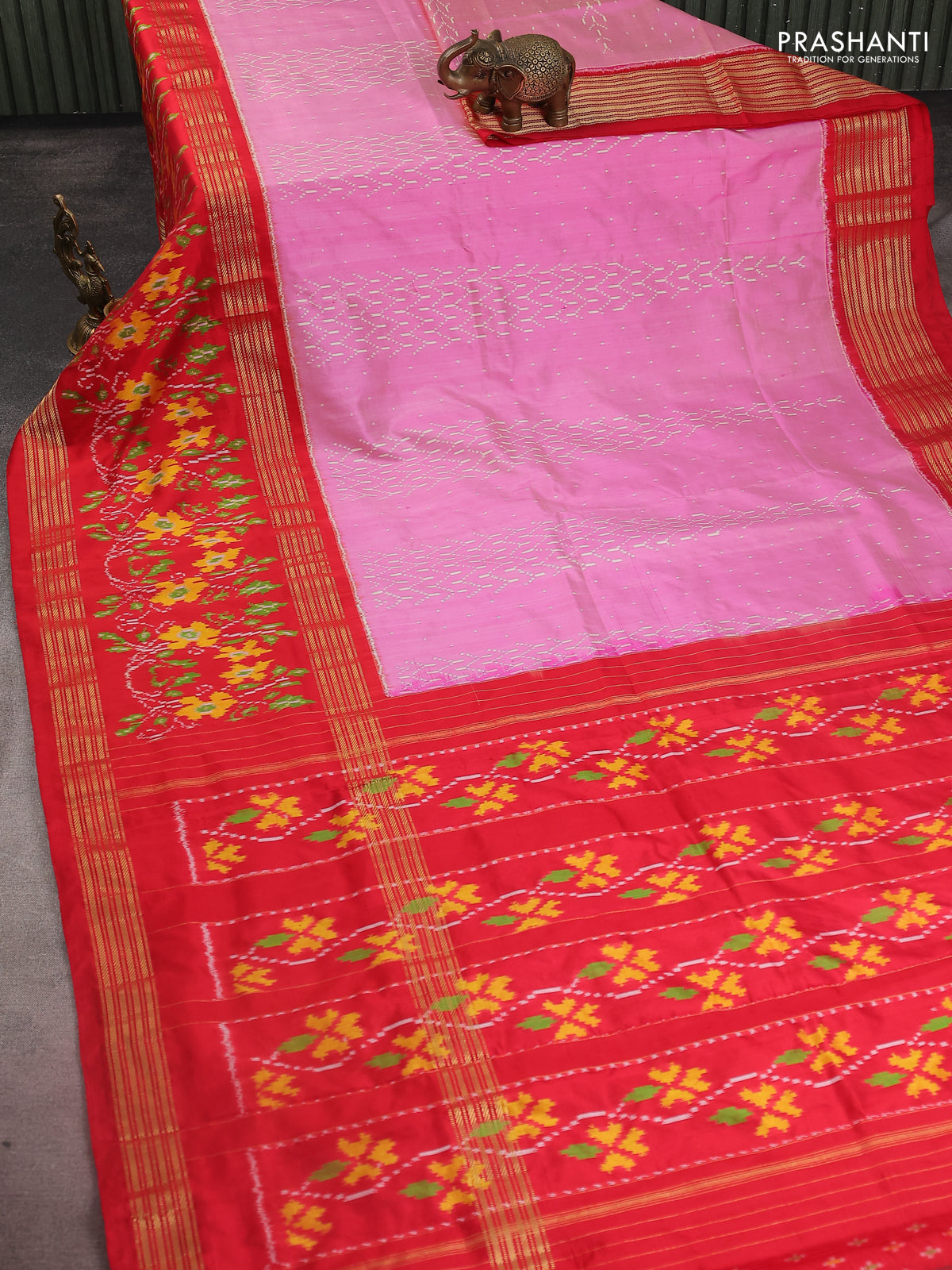 Pochampally silk saree light pink and red with allover ikat weaves and long ikat woven zari border