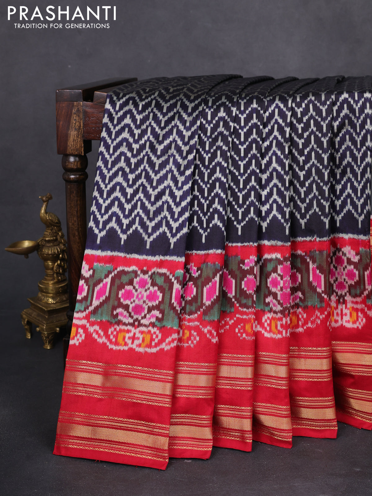 Pochampally silk saree navy blue and red with allover ikat weaves and long ikat woven rettapet zari border