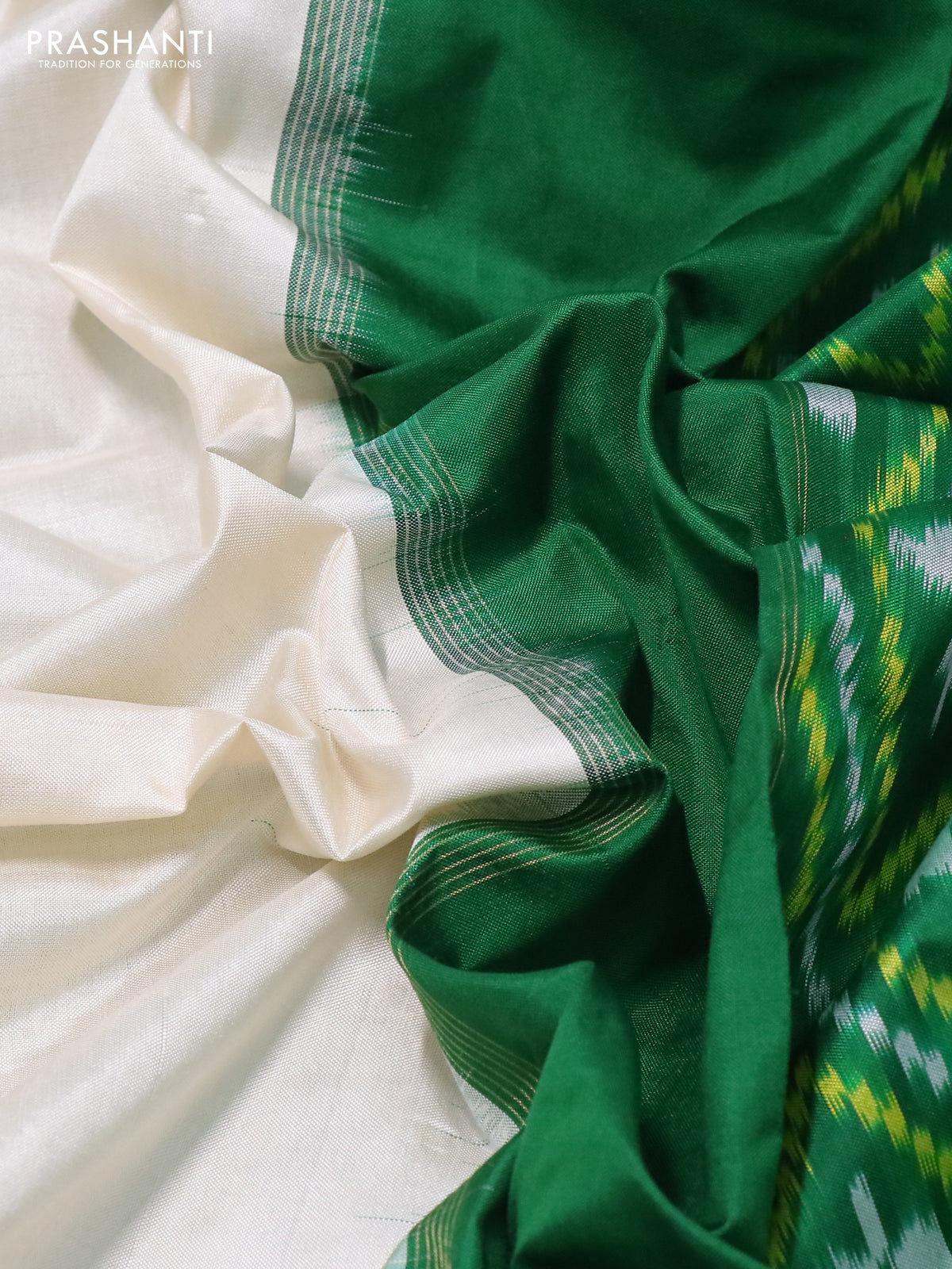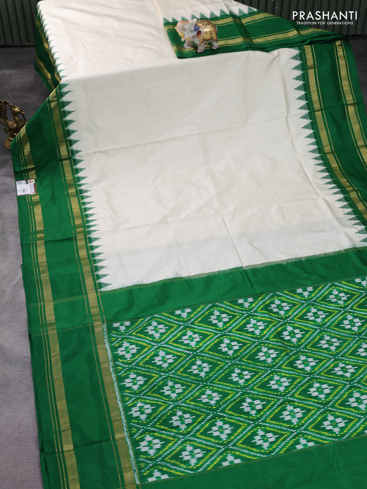Pochampally silk saree off white and green with plain body and temple design zari woven border