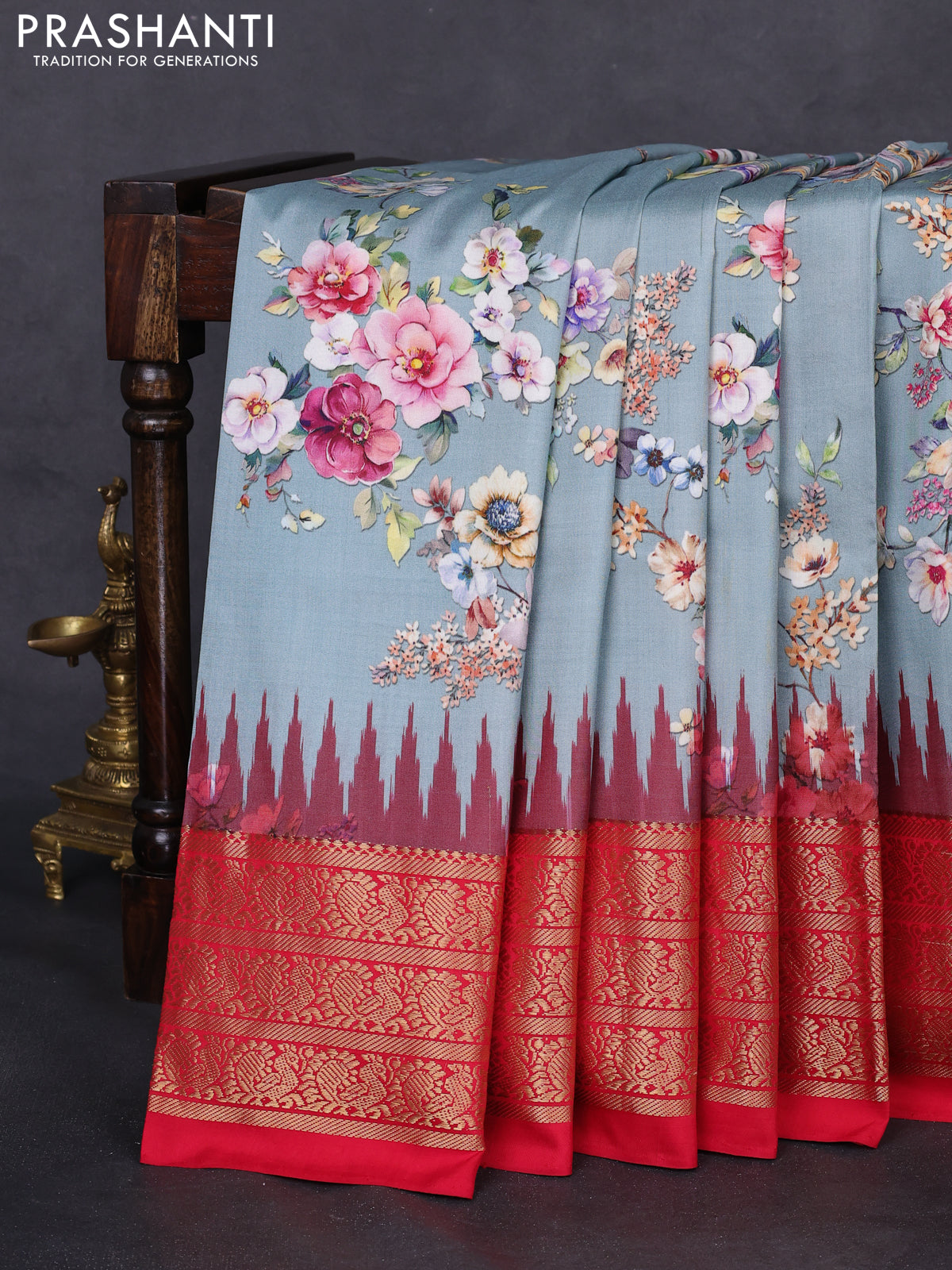Pochampally silk saree pastel blue shade and red with allover floral digital prints and temple design annam zari woven border