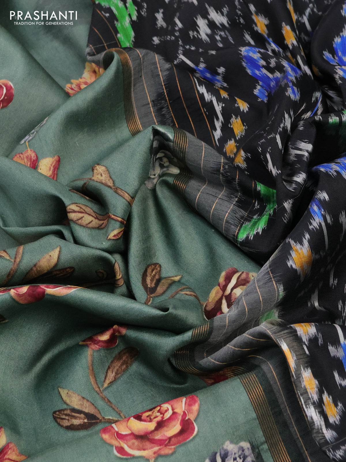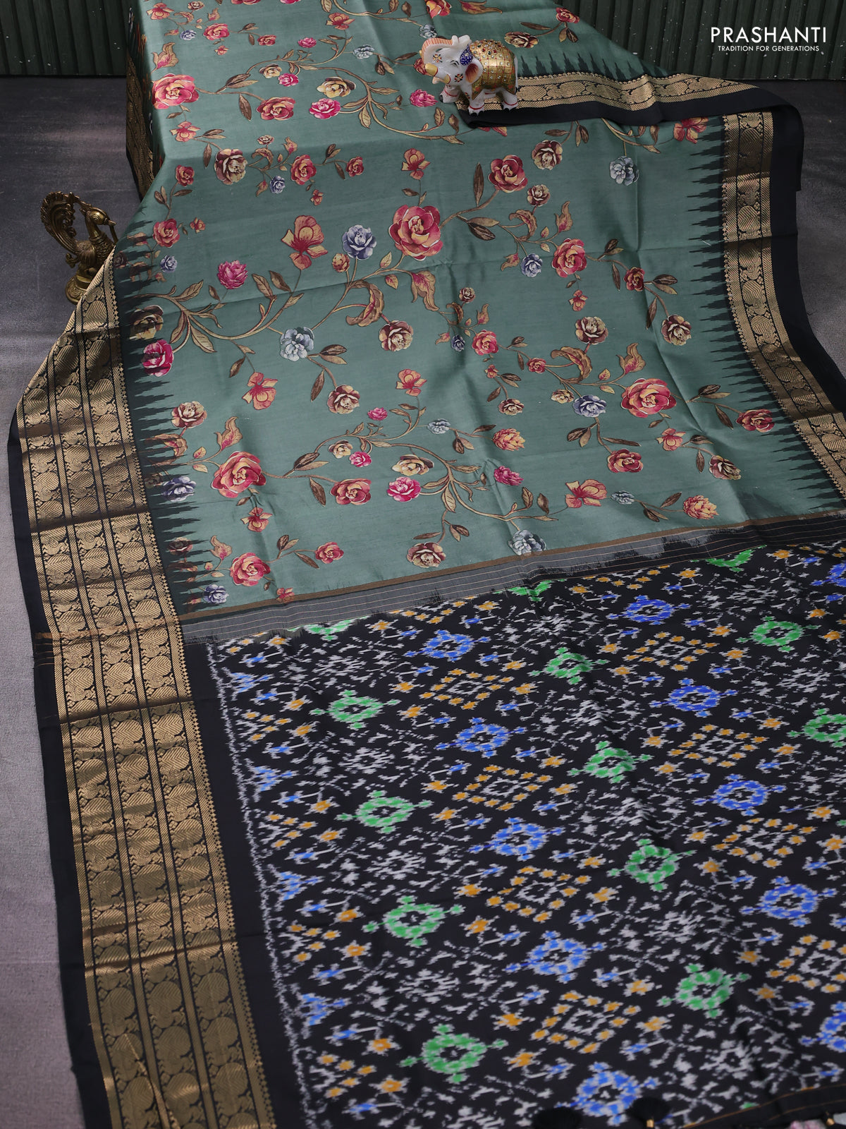 Pochampally silk saree pastel green and black with allover floral digital prints and temple design annam zari woven border