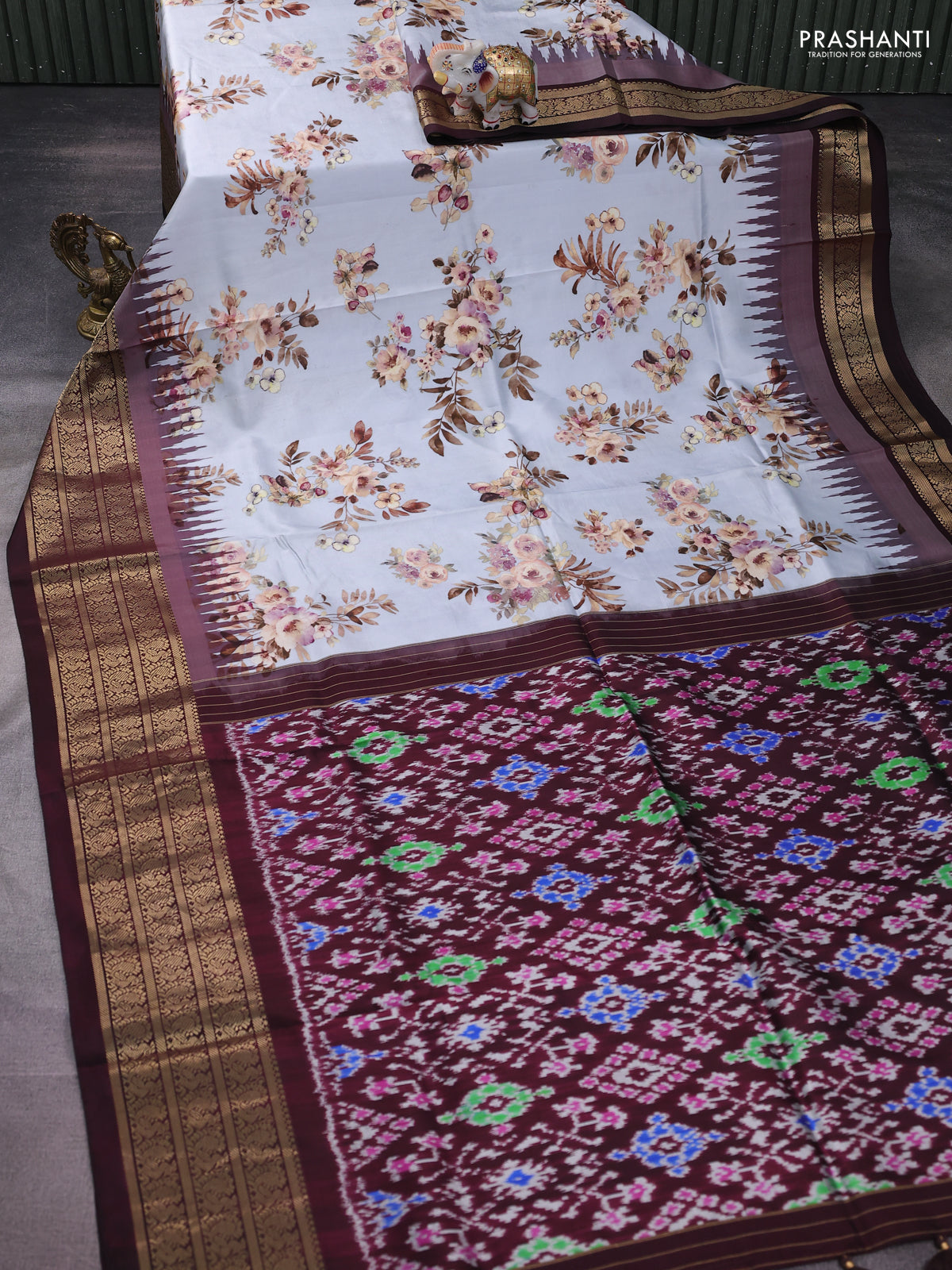 Pochampally silk saree pastel grey and deep maroon with allover floral digital prints and temple design annam zari woven border
