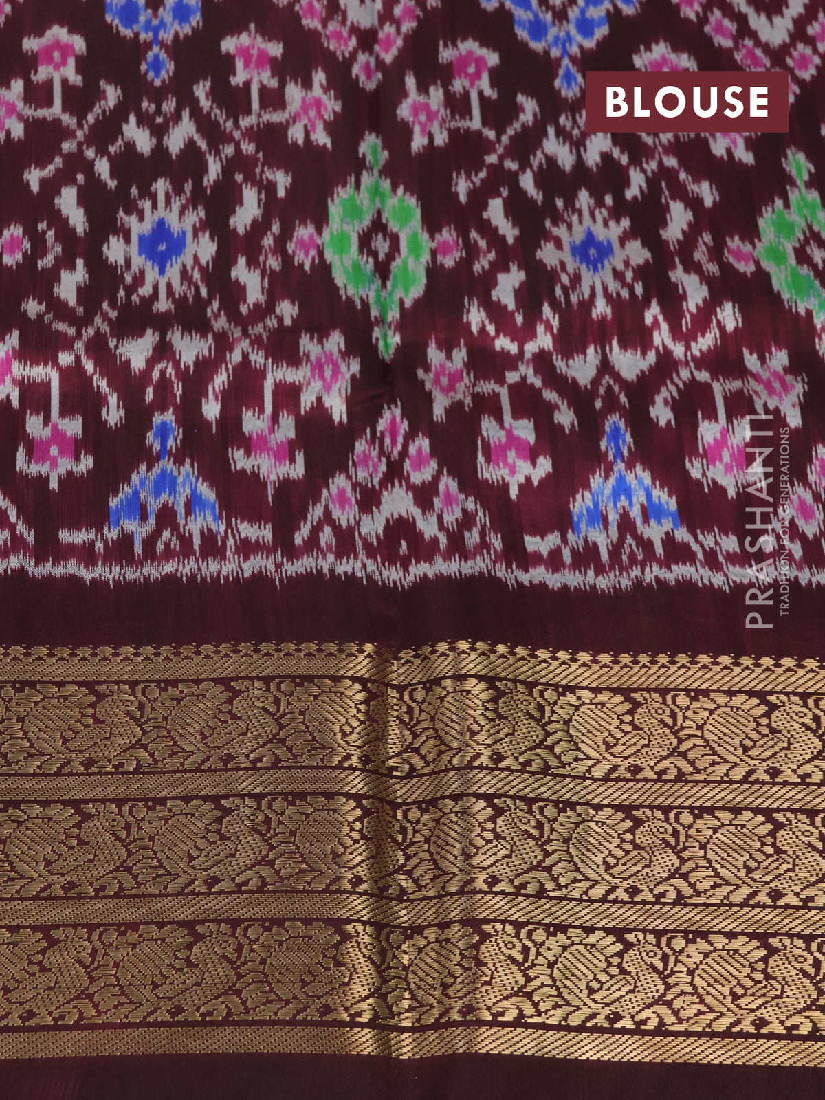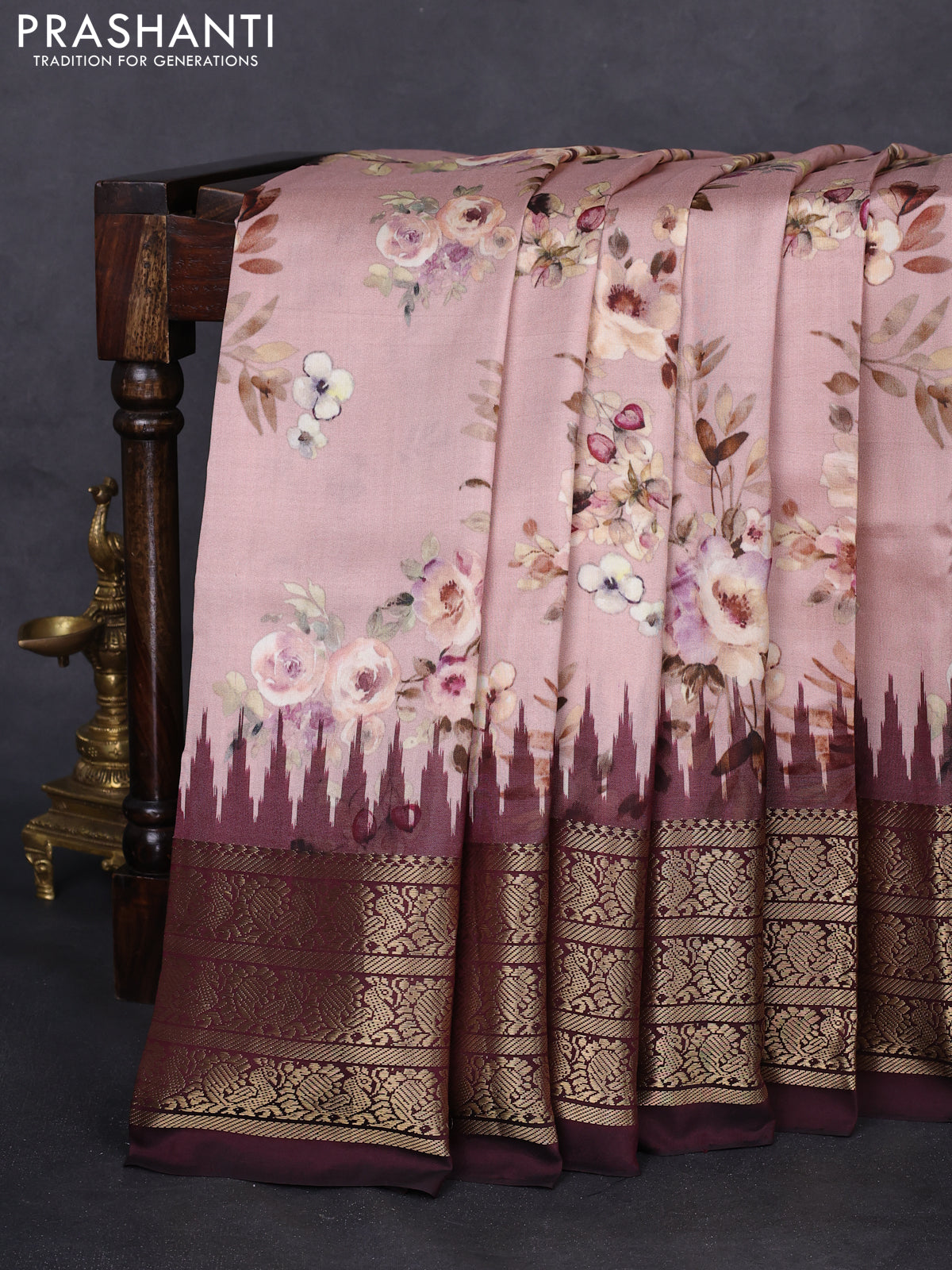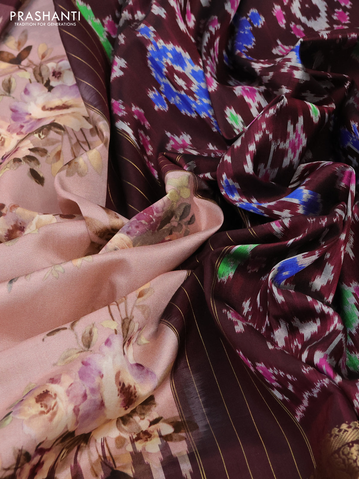 Pochampally silk saree pastel peach and wine shade with allover floral digital prints and temple design annam zari woven border