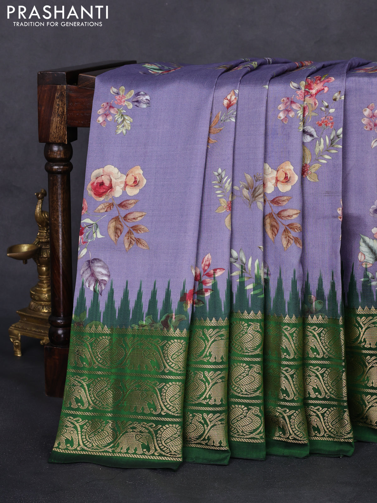 Pochampally silk saree pastel violet and green with allover floral digital prints and temple design zari woven border