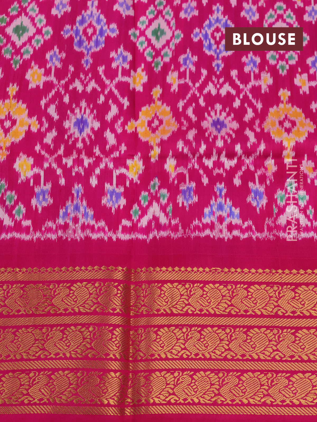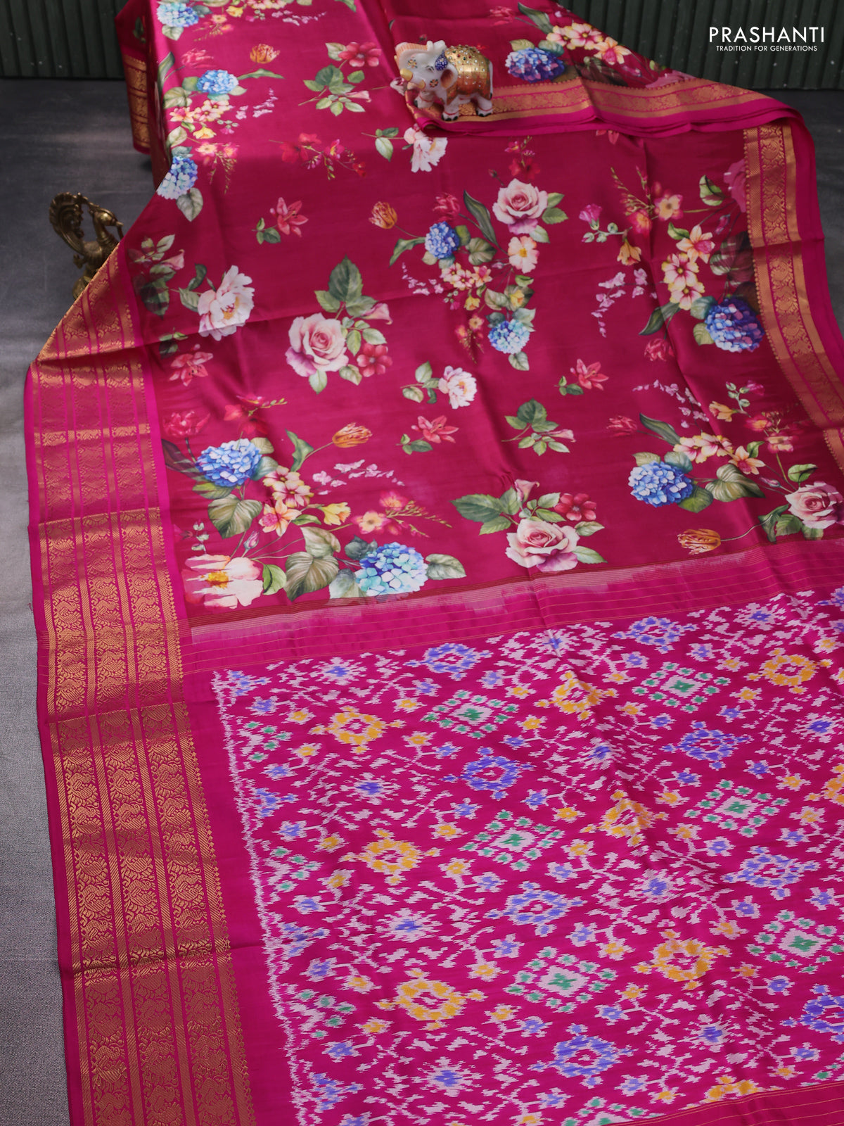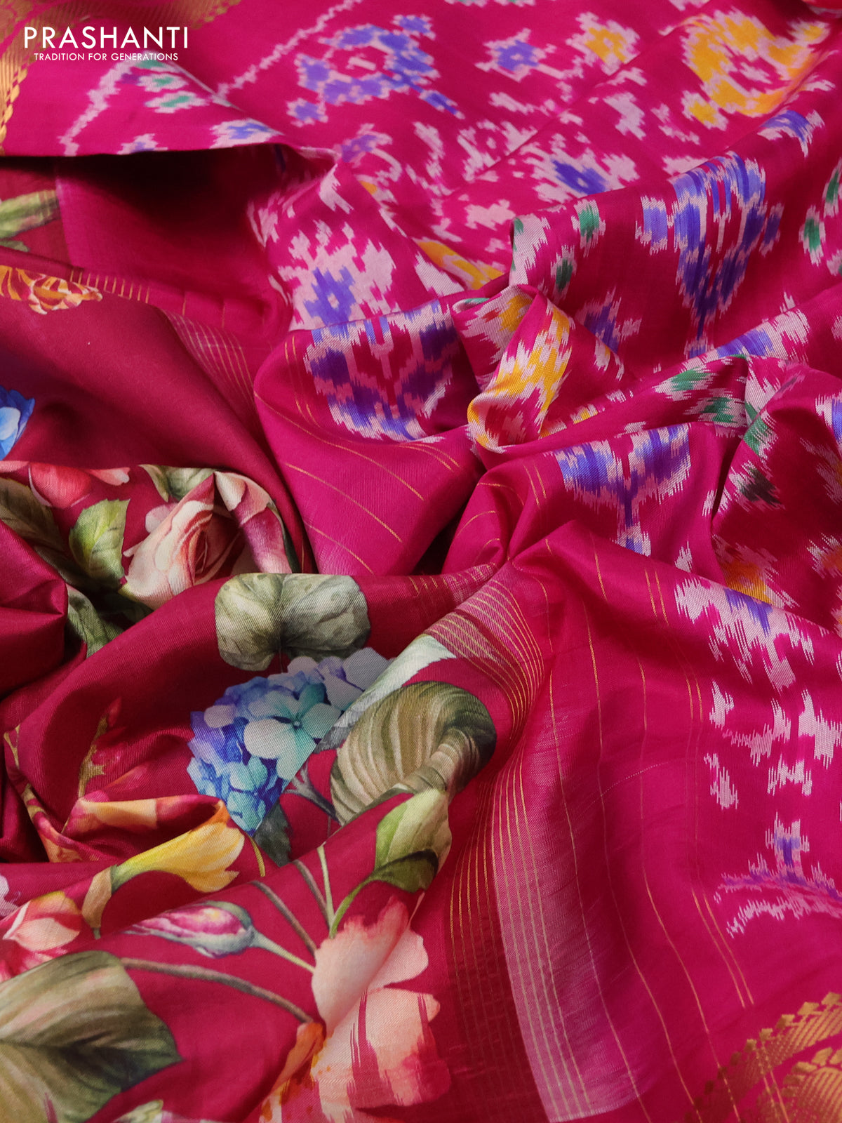 Pochampally silk saree pink with allover floral digital prints and temple design annam zari woven border