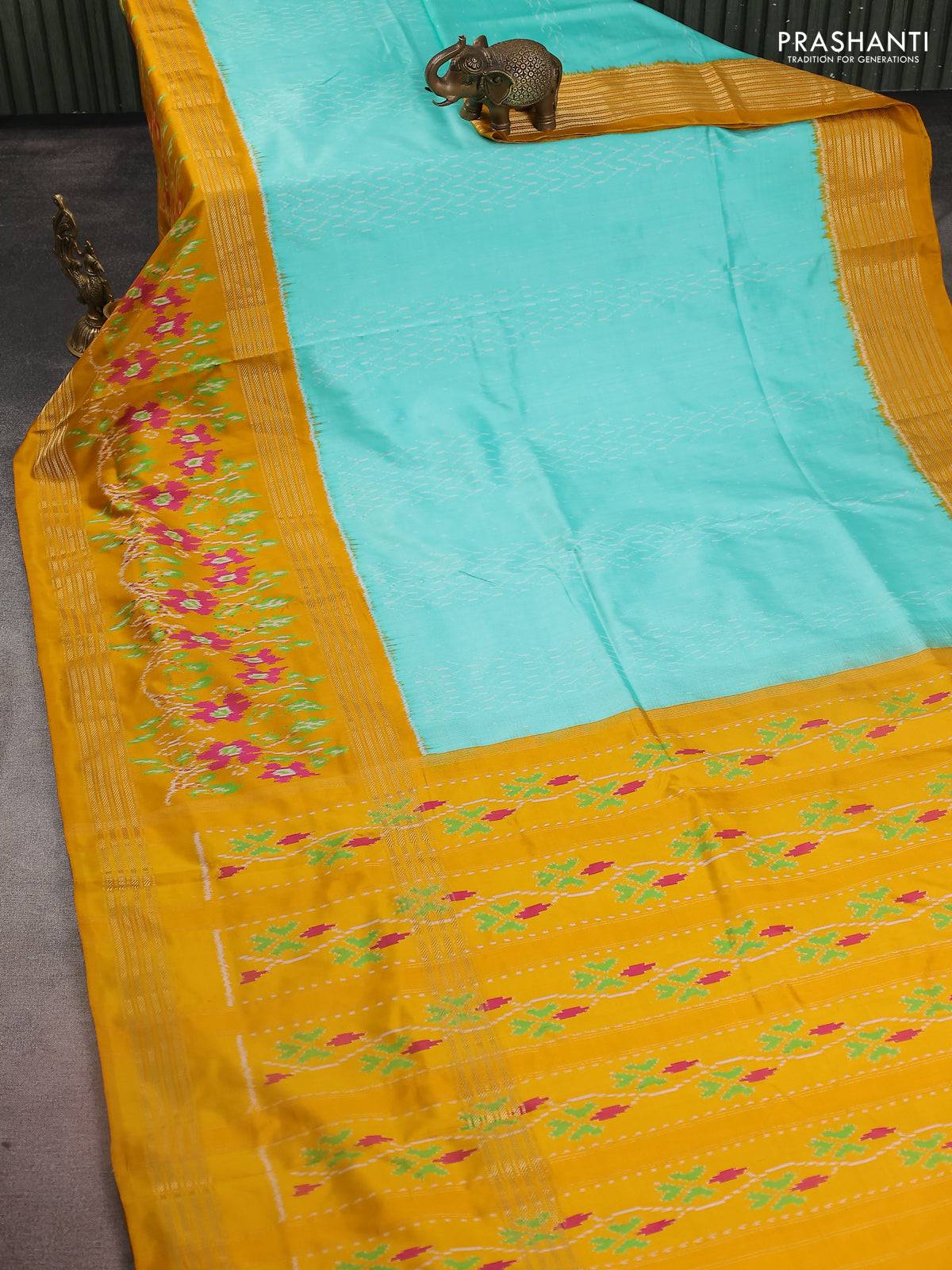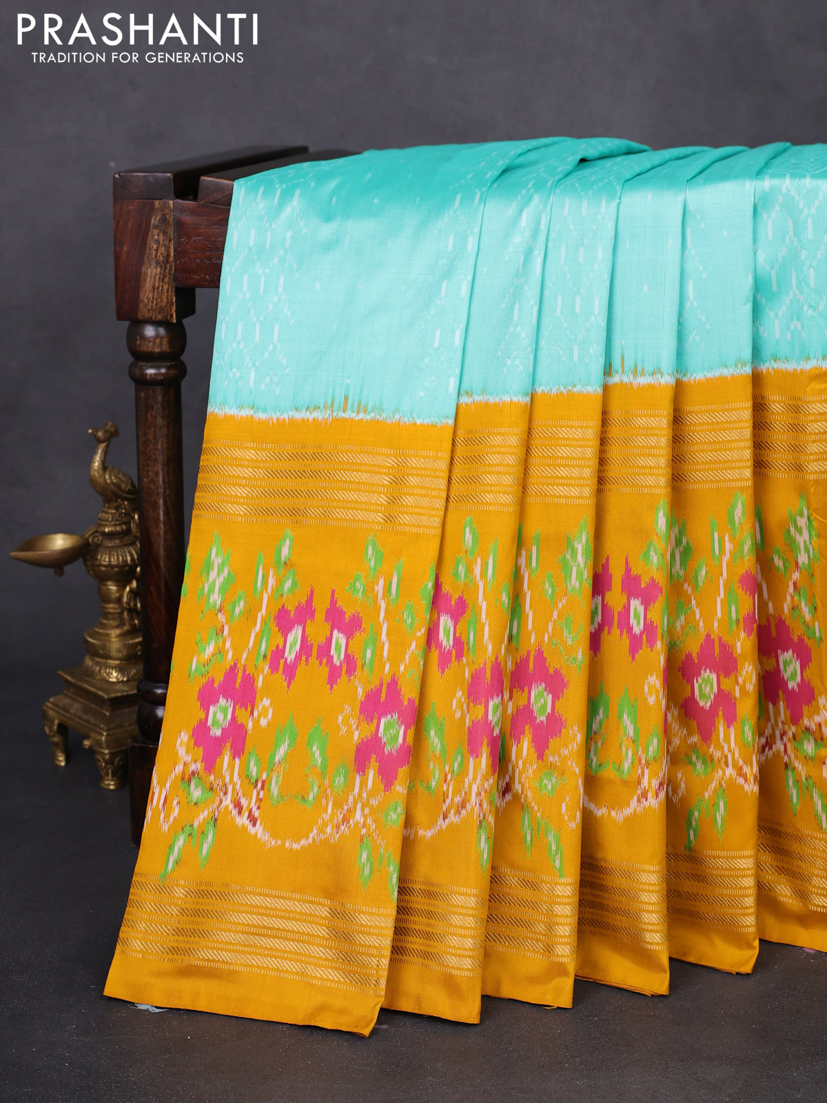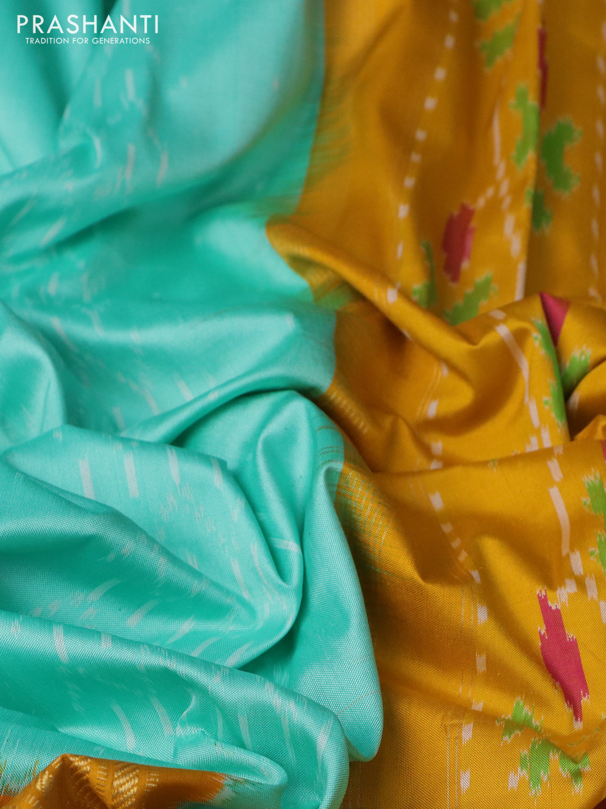 Pochampally silk saree teal blue shade and mustard yellow with allover ikat weaves and long ikat woven zari border