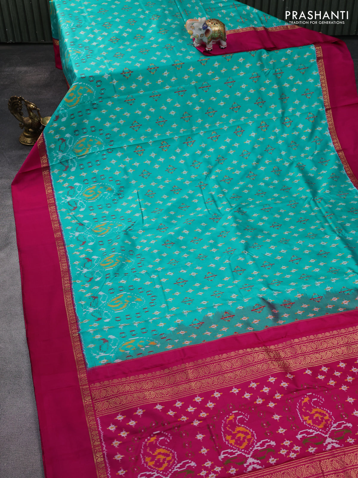 Pochampally silk saree teal green and pink with allover ikat weaves and zari woven simple border