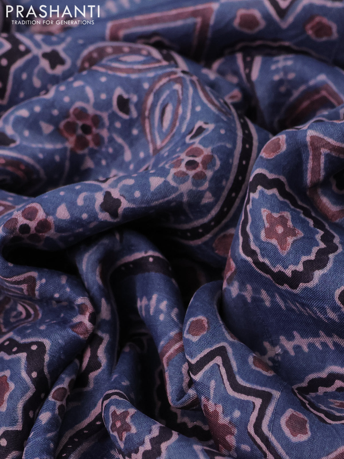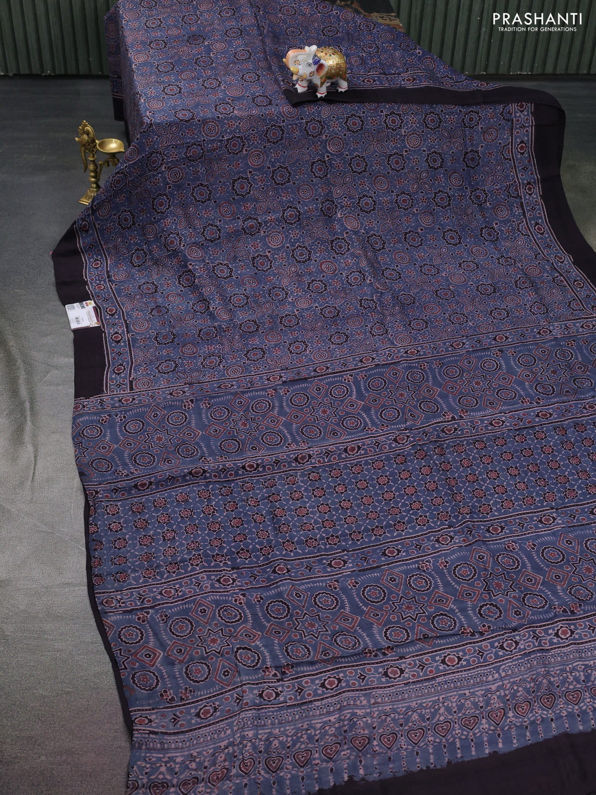 Printed silk saree bluish grey and black with allover ajrakh prints and simple border