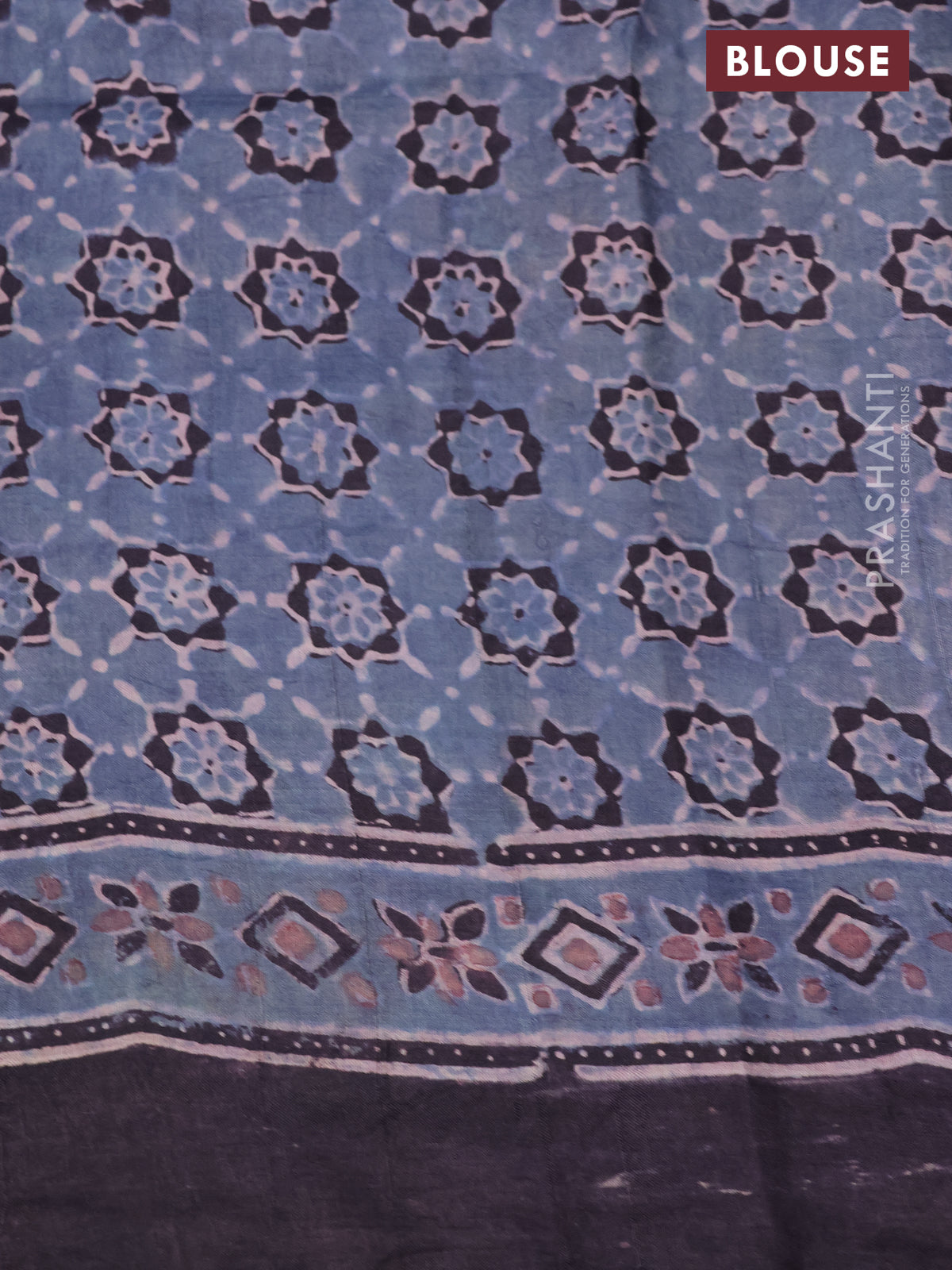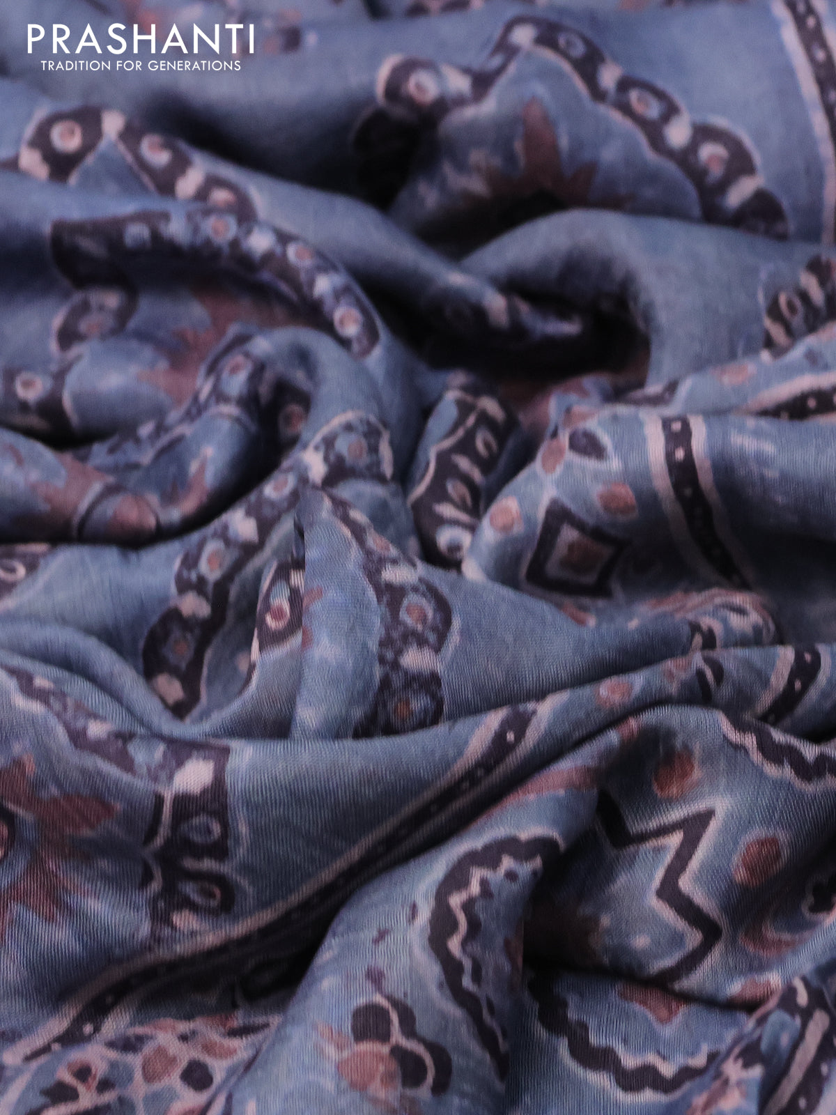 Printed silk saree bluish grey and deep jamun with allover ajrakh prints and simple border