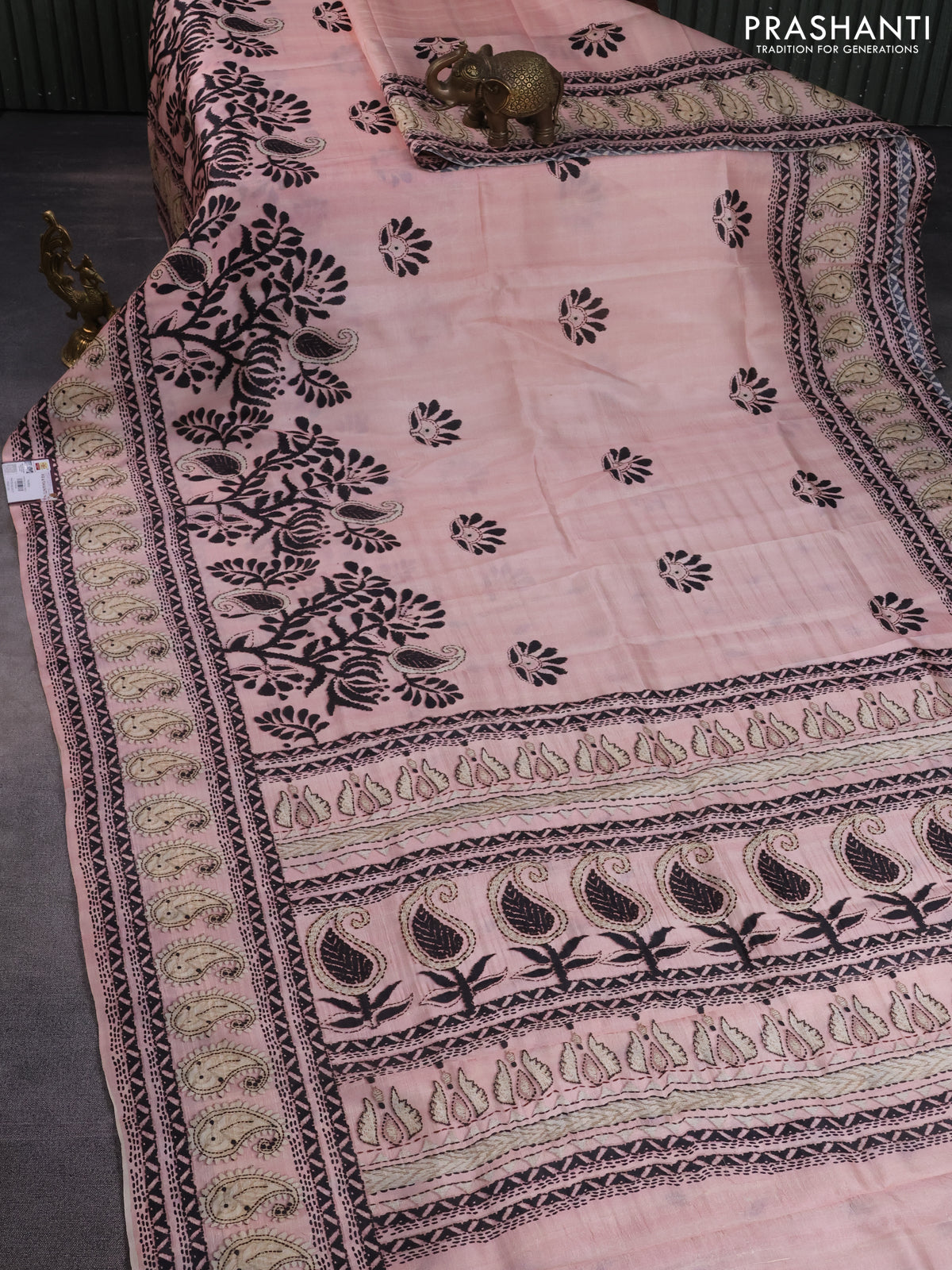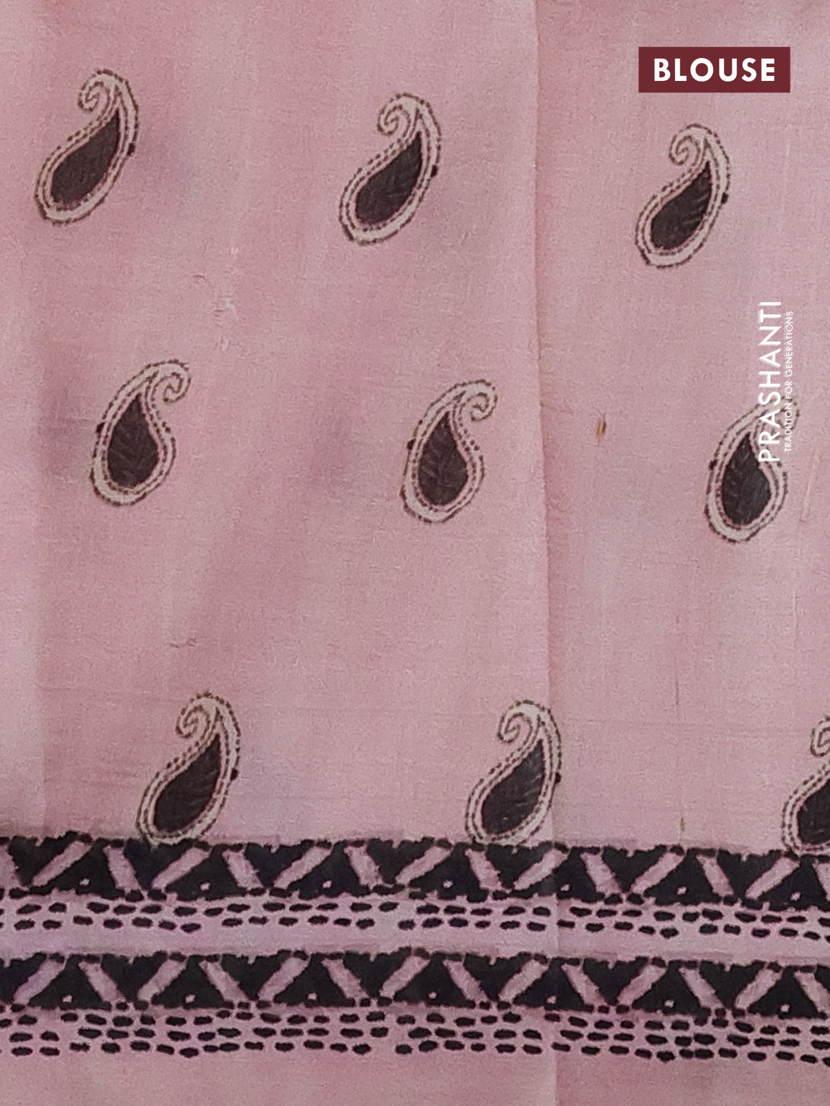 Printed silk saree mild peach pink with butta prints and long madhubani printed border